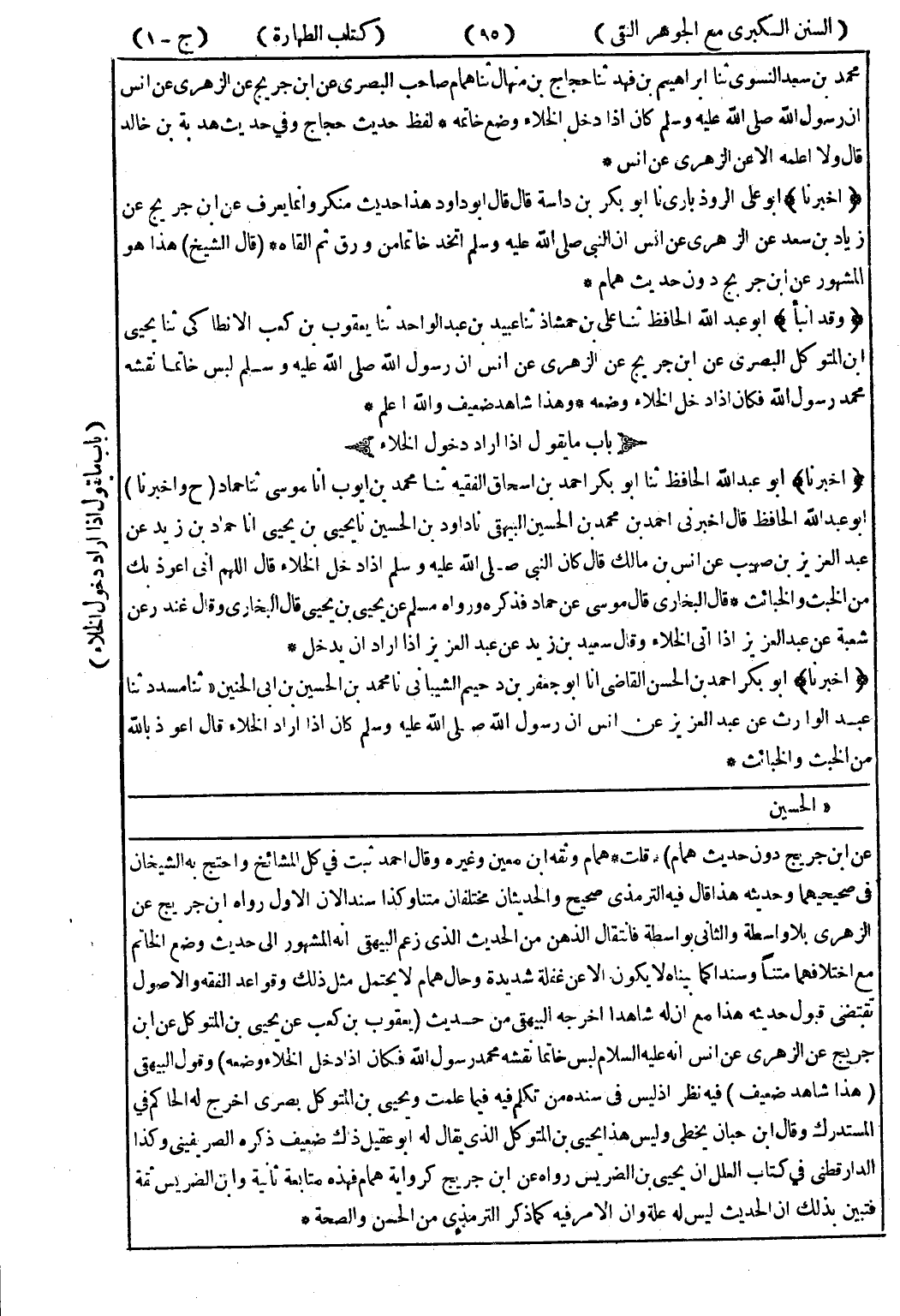 عن ابن جريج دون حديث همام) * قلت * همام وثقه ابن معين وغيره وقال احمد ثبت في كل المشائخ واحتج به الشيخان في صحيحيهما وحديثه هذا قال فيه الترمذي صحيح والحديثن مختلفان متنا وكذا سند الان الاول رواه ابن جريج عن الزهري بلا واسطة والثانى بواسطة فانتقال الذهن من الحديث الذى زعم البيهقى انه المشهور إلى حديث وضع الخاتم مع اختلافهما متنا وسندا كما بيناه لا يكون الاعن غفله شديدة وحال همام لا يحتمل مثل ذلك وقواعد الفقه والاصول تقبتضى قبول حديثه هذا مع ان له شاهد اخرجه البيهقى من حديث (يعقوب بن كعب عن يحيى بن المتوكل عن ابن جريج عن الزهري عن انس انه عليه السلام خاتما نقشه محمد رسول الله فكان إذا دخل الخلاء وضعه) وقول البيهقى (هذا شاهد ضعيف) فيه نظر إذ ليس في سنده من تكلم فيه فيما علمت ويحيى بن المتوكل بصرى اخرج له الحاكم في المستدرك وقال ابن حبان يخطى وليس هذا يحيى بن المتوكل الذى يقال له أبو عقيل ذاك ضعيف ذكره الصريفينى وكذا الدارقطني في كتاب ان يحيى بن الضريس رواه عن ابن جريج كرواية همام فهذه متابعة ثانية وابن الضريس ثقة فتبين بذلك ان الحديث ليس له علة وان الامر فيه كما ذكر الترمذي من الحسن والصحة *