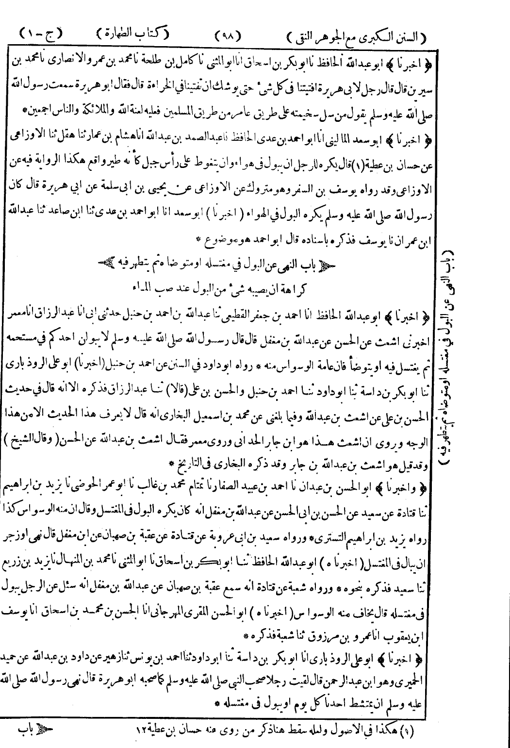 (وأخبرنا) أبو الحسن بن عبدان نا احمد بن عبيد الصفار نا تمتام محمد بن غالب نا أبو عمر الحوضى نا يزيد بن ابراهيم ثنا قتادة عن سعيد عن الحسن بن ابى الحسن عن عبد الله بن مغفل انه كان يكره البول في المغتسل وقال ان منه الوسواس كذا رواه يزيد بن ابراهيم التسترى.