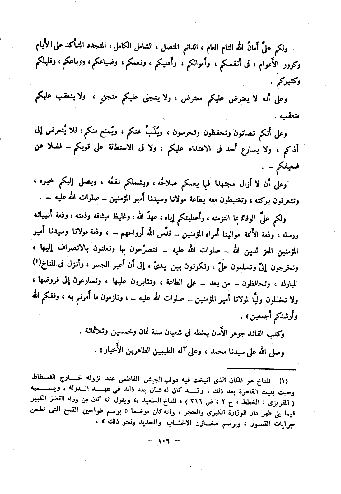 ولكم علي الوفاء بما التزمته، وأعطيتكم إياه، عهد الله، وغليظ ميثاقه وذمته، وذمة أنبيائه ورسله، وذمة الأئمة موالينا أمراء المؤمنين قدس الله أرواحهم، وذمة مولانا وسيدنا أمير المؤمنين المعز لدين الله صلوات الله عليه فتصرحون بها وتعلنون بالانصراف إليها، وتخرجون إلي وتسلمون علي، وتكونون بين يدي، إلى أن أعبر الجسر، وأنزل في المناخ المبارك، وتحافظون من بعد على الطاعة، وتثابرون عليها، وتسارعون إلى فروضها، ولا تخذلون وليا لمولانا أمير المؤمنين صلوات الله عليه، وتلزمون ما أمرتم به، وفقكم الله وأرشدكم أجمعين.