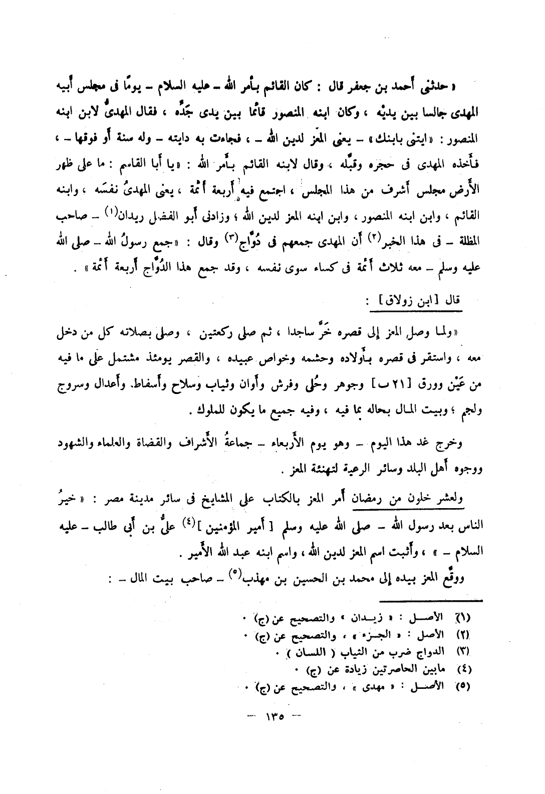 حدثني أحمد بن جعفر قال: كان القائم بأمر الله عليه السلام يوماً في مجلس أبيه المهدي جالسا بين يديه، وكان ابنه المنصور قائما بين يدي جده، فقال المهدي لابن ابنه المنصور: ايتني بابنك يعني المعز لدين الله، فجاءت به دايته وله سنة أو فوقها، فأخذه المهدي في حجره وقبله، وقال لابنه القائم بأمر الله: يا أبا القاسم: ما على ظهر الأرض مجلس أشرف من هذا المجلس، اجتمع فيه أربعة أئمة، يعني المهدي نفسه، وابنه القائم، وابن ابنه المنصور، وابن ابنه المعز لدين الله؛ وزادني أبو الفضل ريدان صاحب المظلة في هذا الخبر أن المهدي جمعهم في دواج وقال: جمع رسول الله صَلَّى اللهُ عَلَيْهِ وَسَلَّمَ معه ثلاث أئمة في كساء سوى نفسه، وقد جمع هذا الدواج أربعة أئمة.