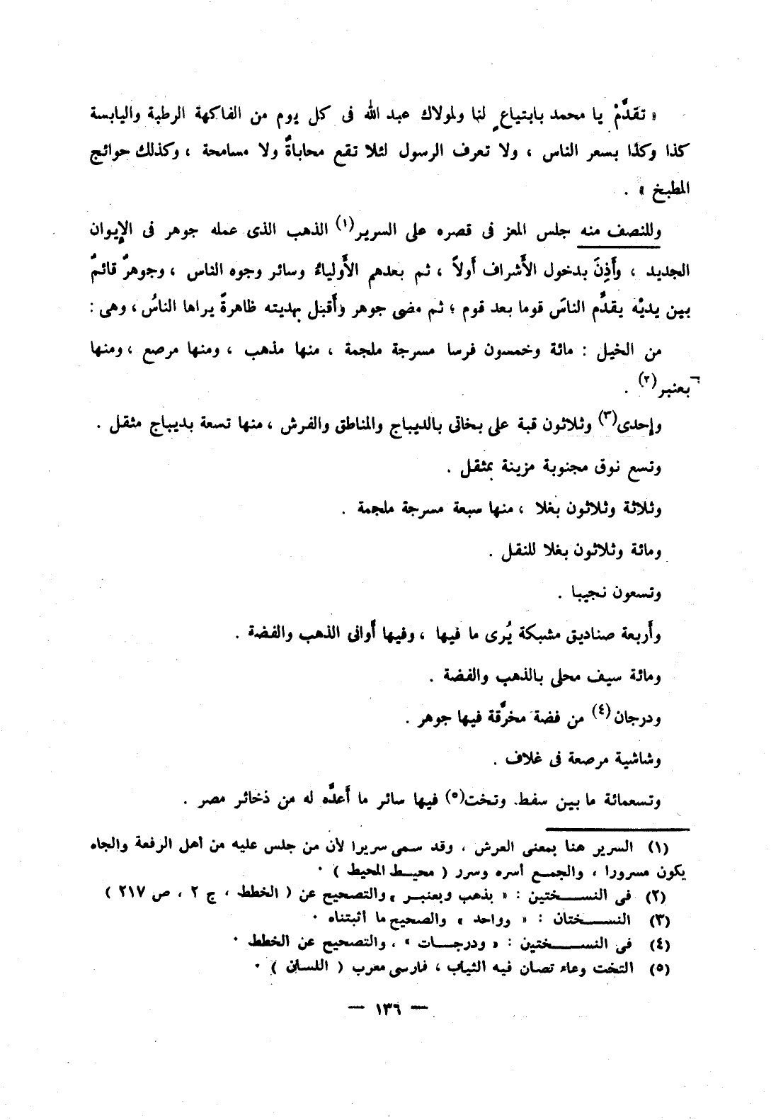 وللنصف منه جلس المعز في قصره على السرير الذهب الذي عمله جوهر في الإيوان الجديد، وأذن بدخول الأشراف أولاً، ثم بعدهم الأولياء وسائر وجوه الناس، وجوهر قائم بين يديه يقدم الناس قوما بعد قوم؛ ثم مضى جوهر وأقبل بهديته ظاهرة يراها الناس، وهي: من الخيل: مائة وخمسون فرساً مسرجة ملجمة، منها مذهب، ومنها مرصع، ومنها بعنبر.