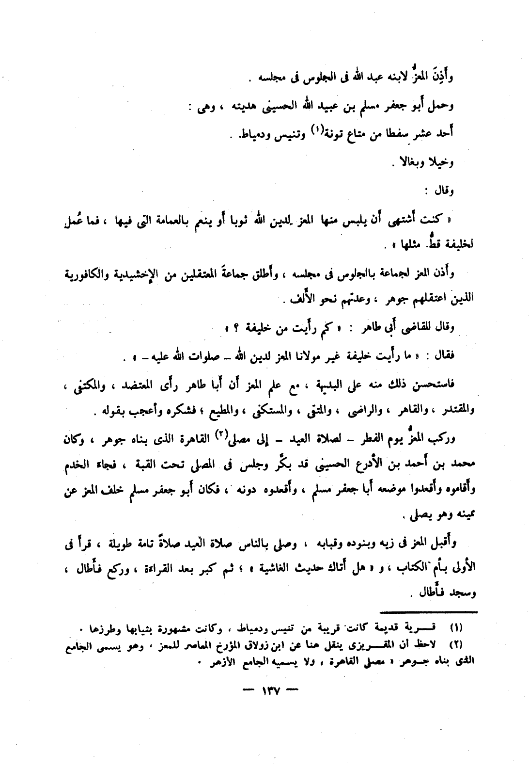 وأقبل المعز في زيه وبنوده وقبابه، وصلى بالناس صلاة العيد صلاةً تامة طويلة، قرأ في الأولى بأم الكتاب، وهل أتاك حديث الغاشية؛ ثم كبر بعد القراءة، وركع فأطال، وسجد فأطال.
