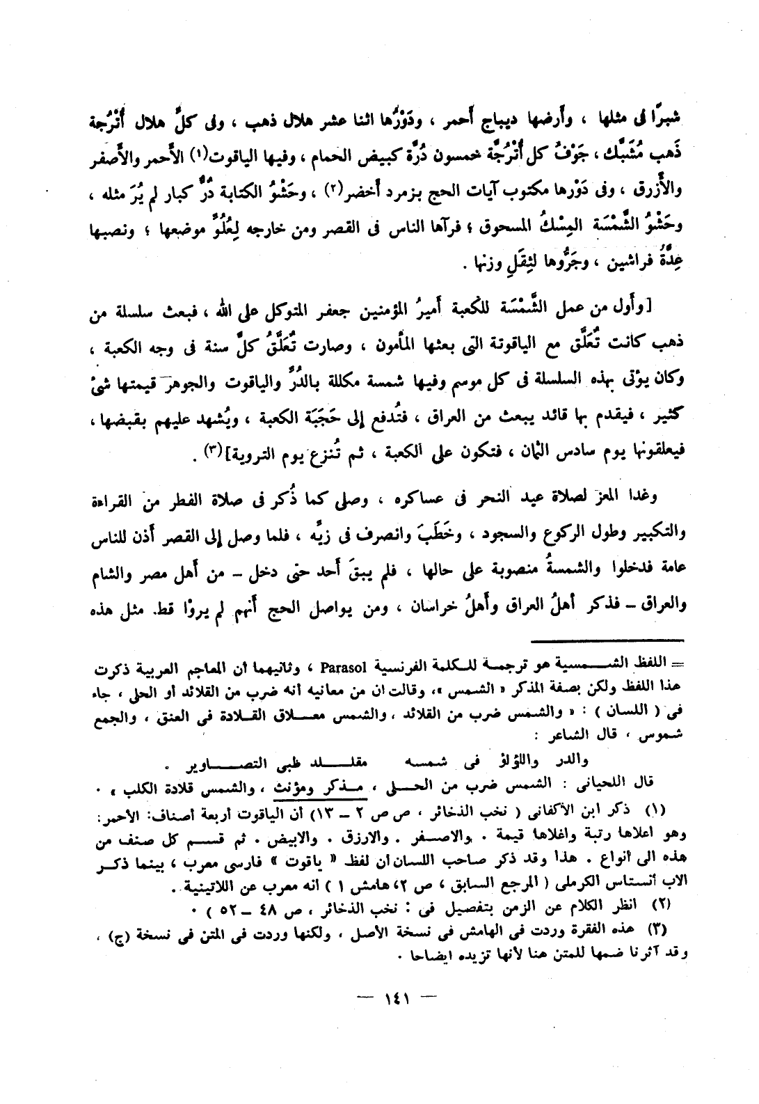 شبراً في مثلها، وأرضها ديباج أحمر، ودورها اثنا عشر هلال ذهب، وفي كل هلال أترجة ذهب مشبك، جوف كل أترجة خمسون درة كبيض الحمام، وفيها الياقوت الأحمر والأصفر والأزرق، وفي دورها مكتوب آيات الحج بزمرد أخضر، وحشو الكتابة در كبار لم ير مثله، وحشو الشمسة المسك المسحوق؛ فرآها الناس في القصر ومن خارجه لعلو موضعها؛ ونصبها عدة فراشين، وجروها لثقل وزنها.