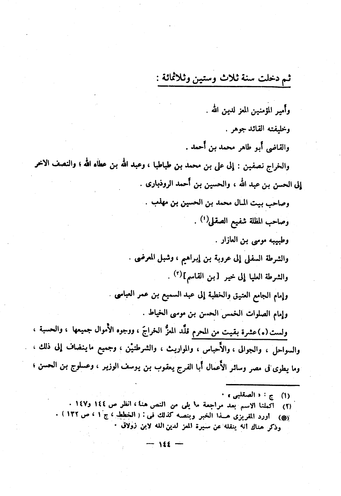 ولست عشرة بقيت من المحرم قلد المعز الخراج، ووجوه الأموال جميعها، والحسبة، والسواحل، والجوالى، والأحباس، والمواريث، والشرطتين، وجميع ما ينضاف إلى ذلك، وما يطوى في مصر وسائر الأعمال أبا الفرج يعقوب بن يوسف الوزير، وعسلوج بن الحسن،