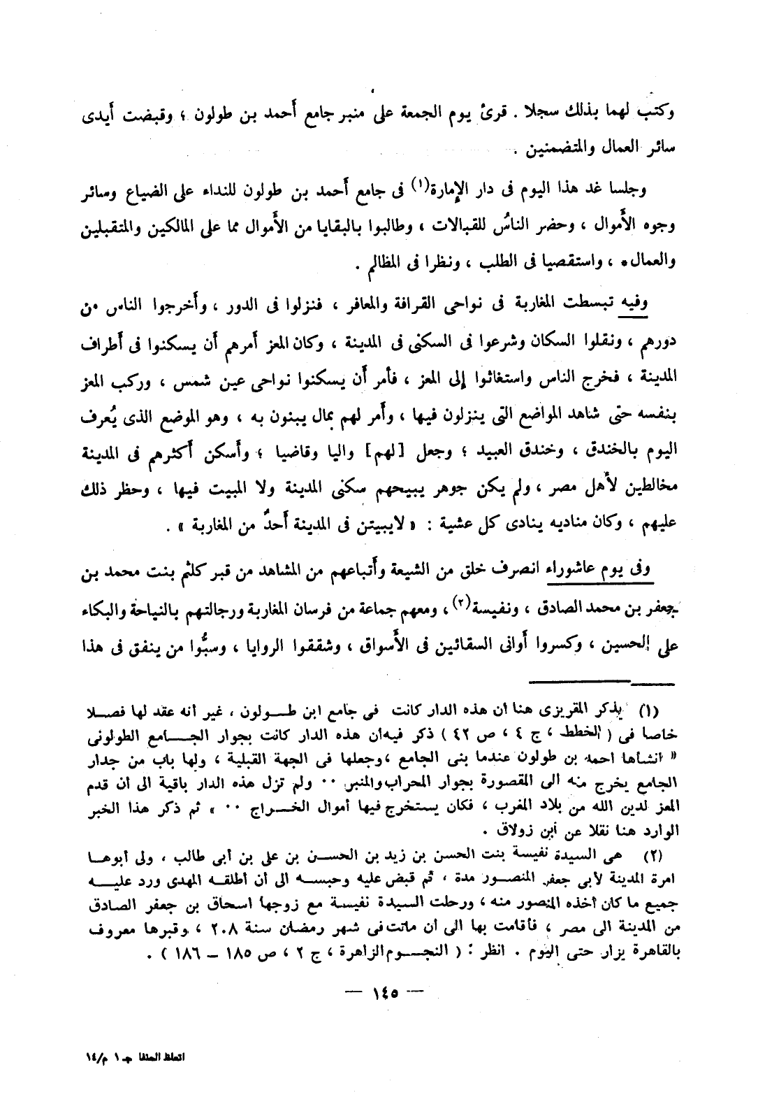 وجلسا غد هذا اليوم في دار الإمارة في جامع أحمد بن طولون للنداء على الضياع وسائر وجوه الأموال، وحضر الناس للقبالات، وطالبوا بالبقايا من الأموال مما على المالكين والمتقبلين والعمال، واستقصيا في الطلب، ونظرا في المظالم.