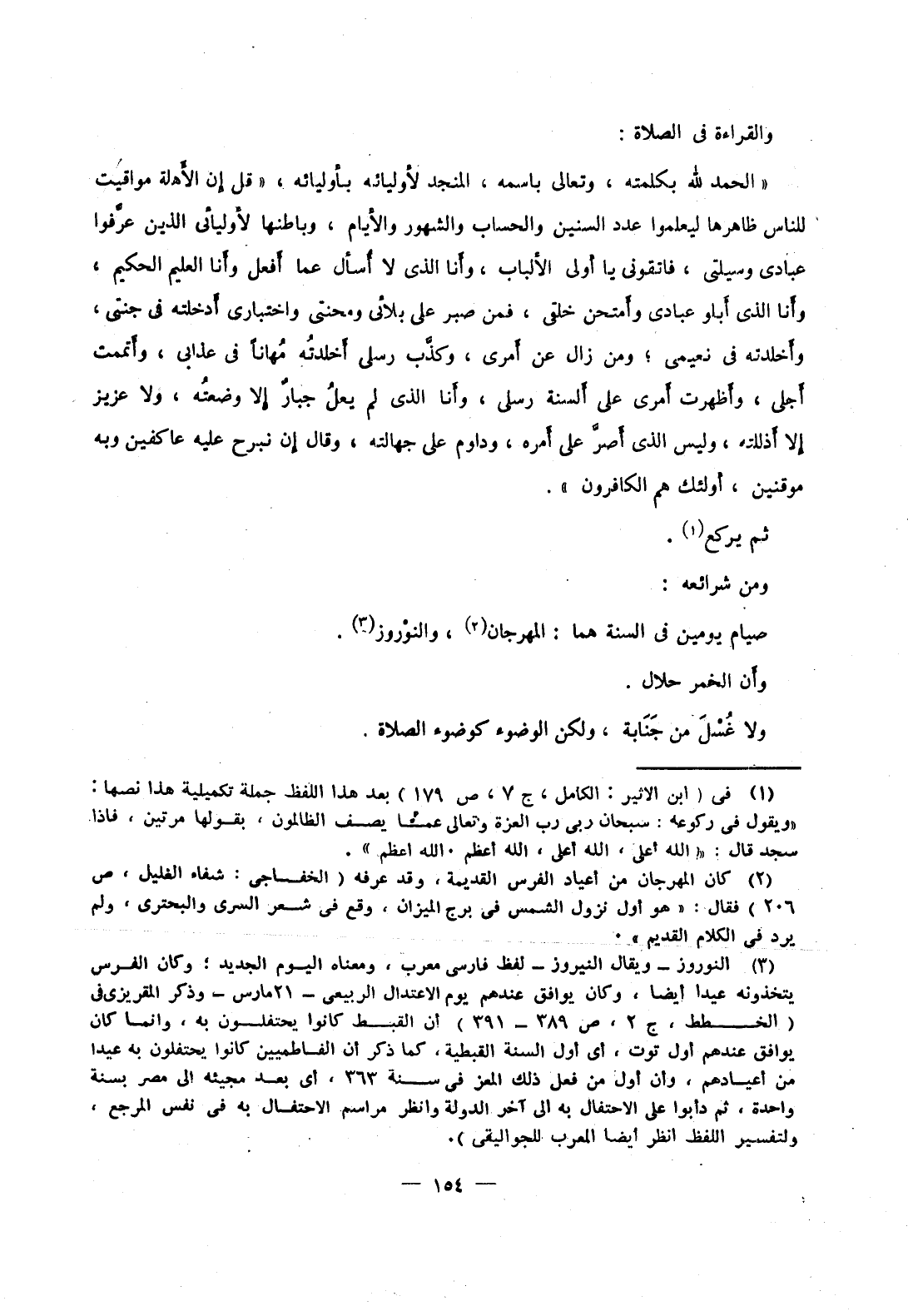 والقراءة في الصلاة: الحمد لله بكلمته، وتعالى باسمه، المنجد لأوليائه بأوليائه، " قل إن الأَهلة مواقيت للناس ظاهرها ليعلموا عدد السنين والحساب والشهور والأَيام، وباطنها لأوليائي الذين عرَّفوا عبادي وسيلتي، فاتقوني يا أولى الألباب، وأنا الذي لا أُسأل عما أفعل وأَنا العليم الحكيم، وأَنا الذي أَبلو عبادي وأَمتحن خلقي، فمن صبر على بلائي ومحنتي واختباري أَدخلته في جنتي، وأَخلدته في نعيمي؛ ومن زال عن أَمري، وكذَّب رسلي أَخلدتُه مُهاناً في عذابي، وأَتممت أجلي، وأَظهرت أَمري على أَلسنة رسلي، وأَنا الذي لم يعلُ جبارٌ إلا وضعتُه، ولا عزيز إلا أَذللته، وليس الذي أصرَّ على أَمره، وداوم على جهالته، وقال إِن نبرح عليه عاكفين وبه موقنين، أولئك هم الكافرون ".