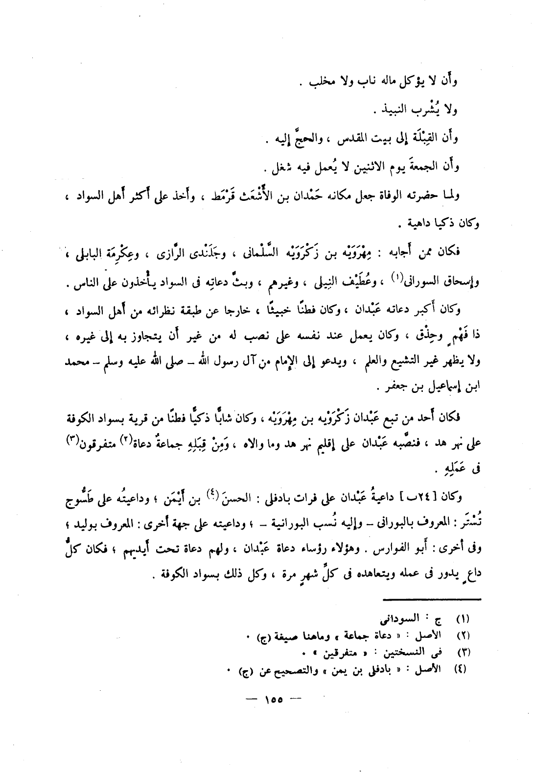 وكان أكبر دعاته عبدان، وكان فطناً خبيثاً، خارجاً عن طبقة نظرائه من أهل السواد، ذا فهم وحذق، وكان يعمل عند نفسه على نصب له من غير أن يتجاوز به إلى غيره، ولا يظهر غير التشيع والعلم، ويدعو إلى الإمام من آل رسول الله ت صَلَّى اللهُ عَلَيْهِ وَسَلَّمَ محمد ابن إسماعيل بن جعفر.