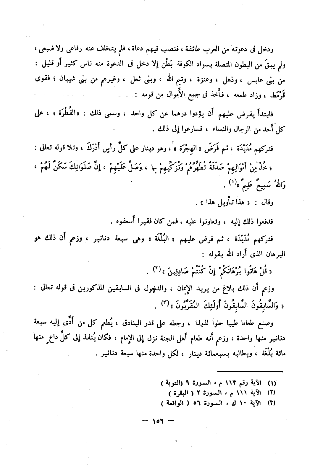 فتركهم مديدة، ثم فرض عليهم البلغة وهي سبعة دنانير، وزعم أن ذلك هو البرهان الذي أراد الله بقوله: " قُلْ هَاتُوا بُرْهَانَكُمْ إِنْ كُنْتُمْ صَادِقِينَ ".