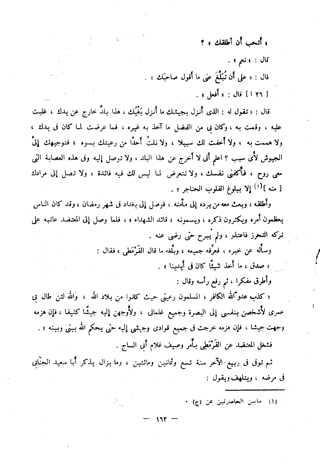 قال: تقول له: الذي أنزل بجيشك ما أنزل بغيك، هذا بلد خارج عن يدك، غلبت عليه، وقمت به، وكان بي من الفضل ما آخذ به غيره، فما عرضت لما كان في يدك، ولا هممت به، ولا أخفت لك سبيلا، ولا نلت أحداً من رعيتك بسوء؛ فتوجيهك إلي الجيوش لأي سبب؟ اعلم أني لا أخرج عن هذا البلد، ولا توصل إليه وفي هذه العصابة التي معي روح، فأكفني نفسك، ولا تتعرض لما ليس لك فيه فائدة، ولا تصل إلى مرادك منه إلا ببلوغ القلوب الحناجر.