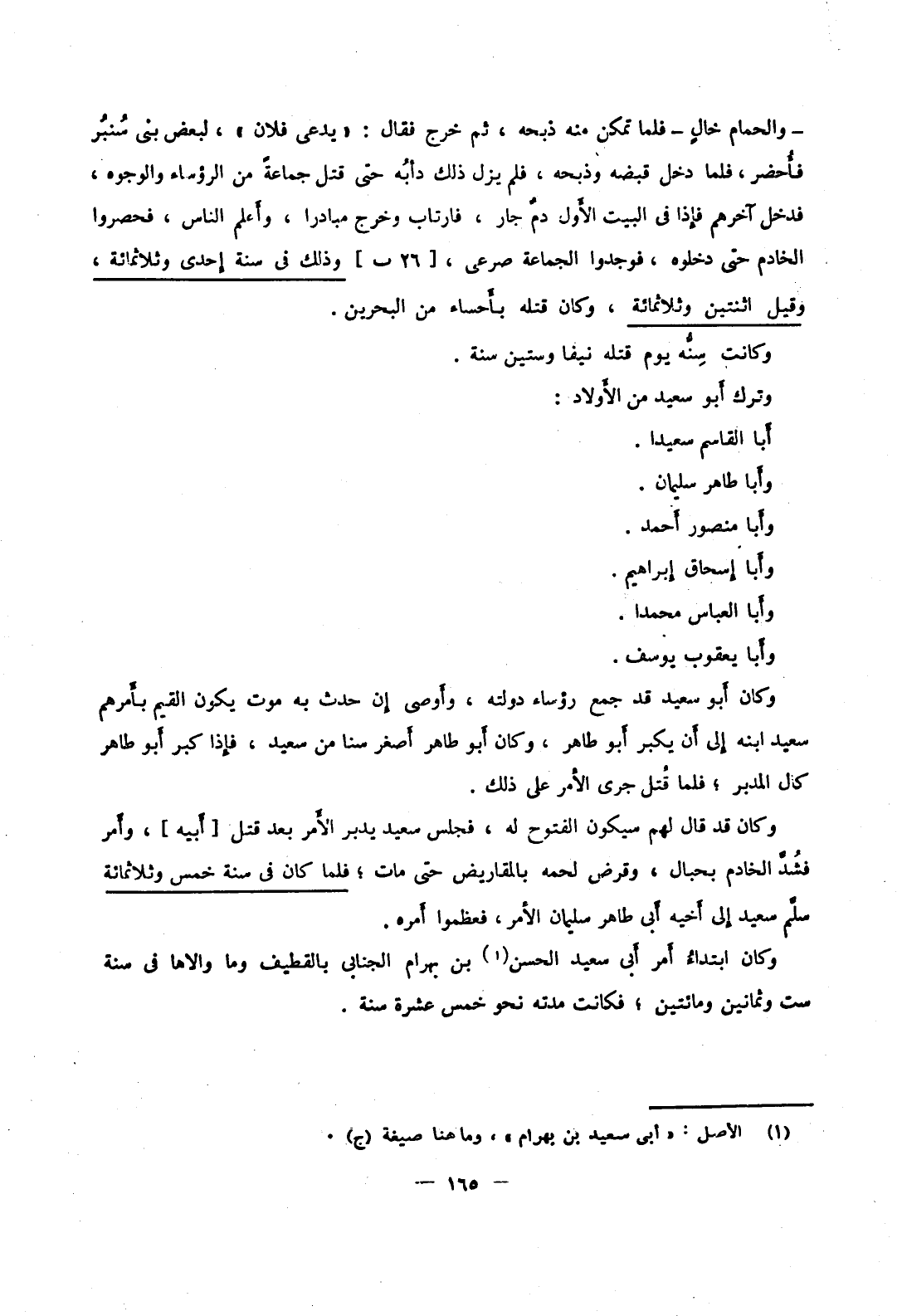 وكان ابتداء أمر أبي سعيد الحسن بن بهرام الجنابي بالقطيف وما والاها في سنة ست وثمانين ومائتين؛ فكانت مدته نحو خمس عشرة سنة.