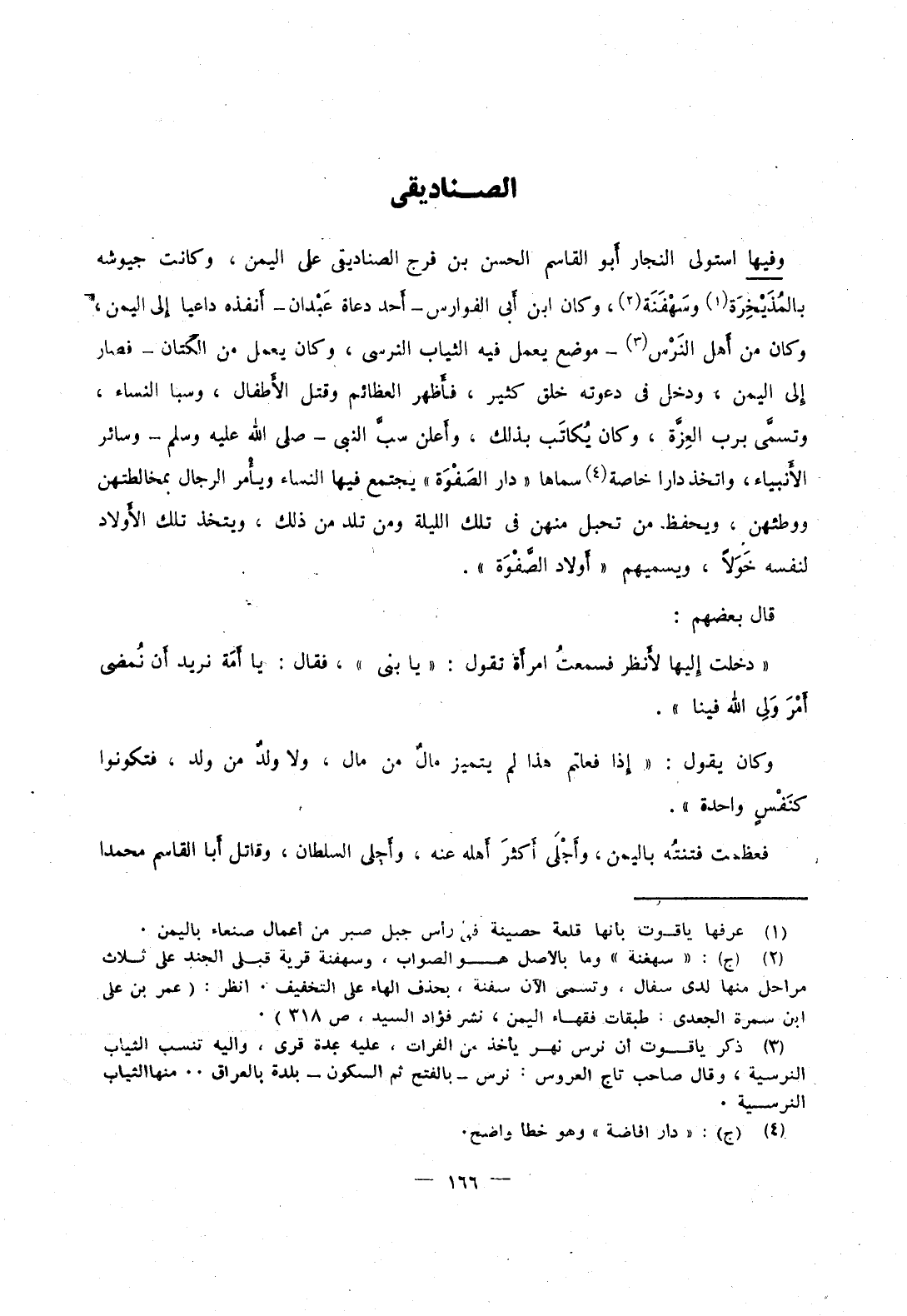 وفيها استولى النجار أبو القاسم الحسن بن فرج الصناديقي على اليمن، وكانت جيوشه بالمذيخرة وسهفنة، وكان ابن أبي الفوارس أحد دعاة عبدان أنفذه داعيا إلى اليمن، وكان من أهل النرس موضع يعمل فيه الثياب النرسي، وكان يعمل من الكتان فصار إلى اليمن، ودخل في دعوته خلق كثير، فأظهر العظائم وقتل الأطفال، وسبا النساء، وتسمى برب العزة، وكان يكاتب بذلك، وأعلن سب النبي صَلَّى اللهُ عَلَيْهِ وَسَلَّمَ وسائر الأنبياء، واتخذ دارا خاصة سماها دار الصفوة يجتمع فيها النساء ويأمر الرجال بمخالطتهن ووطئهن، ويحفظ من تحبل منهن في تلك الليلة ومن تلد من ذلك، ويتخذ تلك الأولاد لنفسه خولاً، ويسميهم أولاد الصفوة.