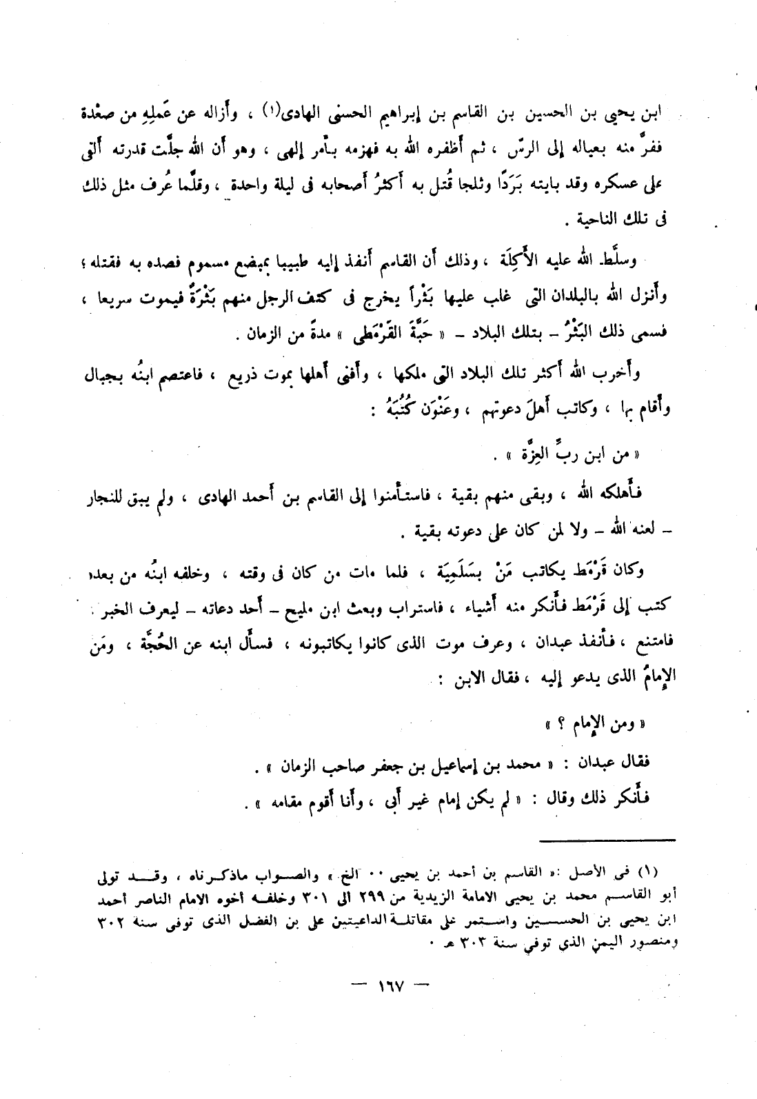 ابن يحيى بن الحسين بن القاسم بن إبراهيم الحسني الهادي، وأزاله عن عمله من صعدة ففر منه بعياله إلى الرس، ثم أظفره الله به فهزمه بأمر إلهي، وهو أن الله جلت قدرته ألقى على عسكره وقد بايته برداً وثلجا قتل به أكثر أصحابه في ليلة واحدة، وقلما عرف مثل ذلك في تلك الناحية.