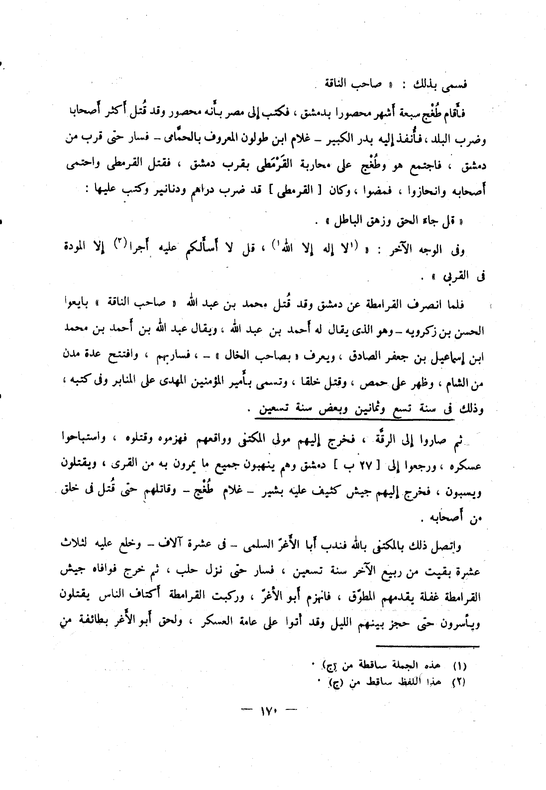 فسمى بذلك: صاحب الناقة فأقام طغج سبعة أشهر محصورا بدمشق، فكتب إلى مصر بأنه محصور وقد قتل أكثر أصحابه وضرب البلد، فأنفذ إليه بدر الكبير غلام ابن طولون المعروف بالحمامي فسار حتى قرب من دمشق، فاجتمع هو وطغج على محاربة القرمطي بقرب دمشق، فقتل القرمطي واحتمى أصحابه وانحازوا، فمضوا، وكان القرمطي قد ضرب دراهم ودنانير وكتب عليها: قل جاء الحق وزهق الباطل.
