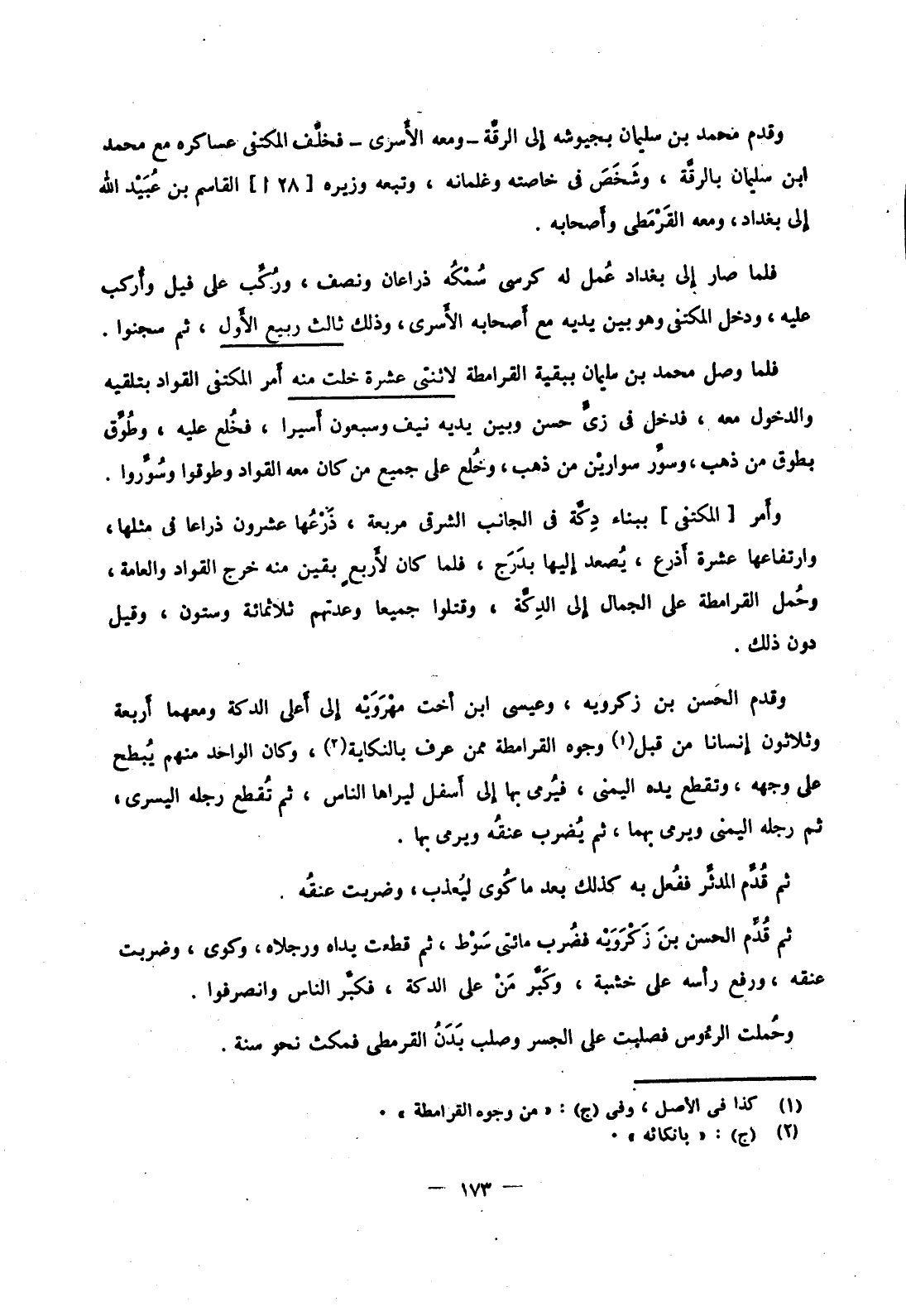 وحملت الرءوس فصلبت على الجسر وصلب بدن القرمطي فمكث نحو سنة.
