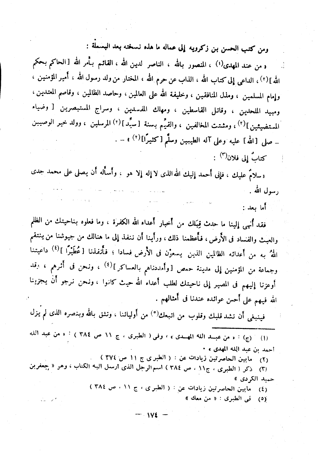 أما بعد: فقد أنهى إلينا ما حدث قبلك من أخبار أعداء الله الكفرة، وما فعلوه بناحيتك من الظلم والعبث والفساد في الأرض، فأعظمنا ذلك، ورأينا أن ننفذ إلى ما هنالك من جيوشنا من ينتقم الله به من أعدائه الظالمين الذين يسعون في الأرض فسادا؛ فأنقذنا عطيراً داعيتنا وجماعة من المؤمنين إلى مدينة حمص وأمددناهم بالعساكر، ونحن في أثرهم، وقد أوعزنا إليهم في المصير إلى ناحيتك لطلب أعداء الله حيث كانوا، ونحن نرجو أن يجزينا الله فيهم على أحسن عوائده عندنا في أمثالهم.
