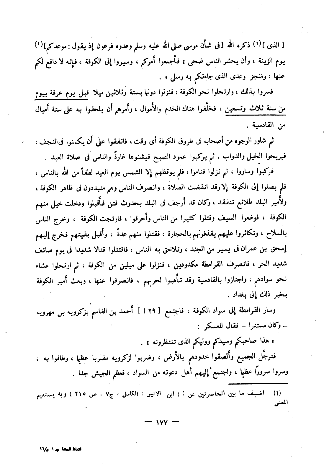 فركبوا وساروا، ثم نزلوا فناموا، فلم يوقظهم إلا الشمس يوم العيد لطفاً من الله بالناس، فلم يصلوا إلى الكوفة إلا وقد انقضت الصلاة، وانصرف الناس وهم متبددون في ظاهر الكوفة، ولأمير البلد طلائع تتفقد، وكان قد أرجف في البلد بحدوث فتن فأقبلوا ودخلت خيل منهم الكوفة، فوضعوا السيف وقتلوا كثيرا من الناس وأحرقوا، فارتجت الكوفة، وخرج الناس بالسلاح، وتكاثروا عليهم يقذفونهم بالحجارة، فقتلوا منهم عدةً، وأقبل بقيتهم فخرج إليهم إسحق بن عمران في يسير من الجند، وتلاحق به الناس، فاقتتلوا قتالا شديدا في يوم صائف شديد الحر، فانصرف القرامطة مكدودين، فنزلوا على ميلين من الكوفة، ثم ارتحلوا عشاء نحو سوادهم، واجتازوا بالقادسية وقد تأهبوا لحربهم، فانصرفوا عنها، وبعث أمير الكوفة بخبر ذلك إلى بغداد.