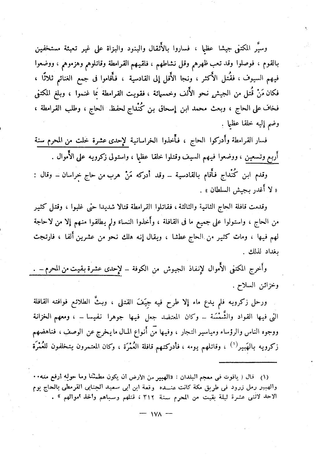 ورحل زكرويه فلم يدع ماء إلا طرح فيه جيف القتلى، وبث الطلائع فوافته القافلة التي فيها القواد والشمسة وكان المعتضد جعل فيها جوهرا نفيسا، ومعهم الخزانة ووجوه الناس والرؤساء ومياسير التجار، وفيها من أنواع المال ما يخرج عن الوصف، فناهضهم زكرويه بالهبير، وقاتلهم يومه، فأدركتهم قافلة العمرة، وكان المعتمرون يتخلفون للعمرة
