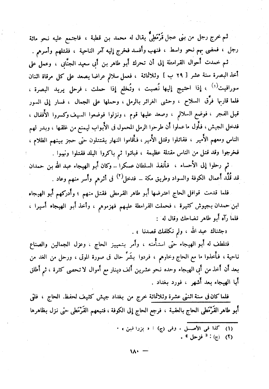 فلما قدمت قوافل الحاج اعترضها أبو طاهر القرمطي فقتل منهم؛ وأدركهم أبو الهيجاء ابن حمدان بجيوش كثيرة، فحملت القرامطة عليهم فهزموهم، وأخذ أبو الهيجاء أسيرا، فلما رآه أبو طاهر تضاحك وقال له: جئناك عبد الله، ولم نكلفك قصدنا.