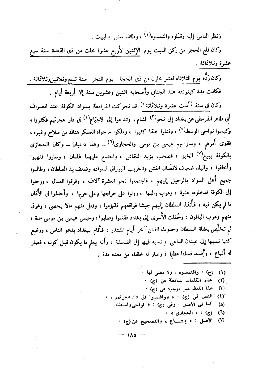 وكان رده يوم الثلاثاء لعشر خلون من ذي الحجة يوم النحر سنة تسع وثلاثين وثلاثمائة. فكانت مدة كينونته عند الجنابي وأصحابه اثنين وعشرين سنة إلا أربعة أيام.