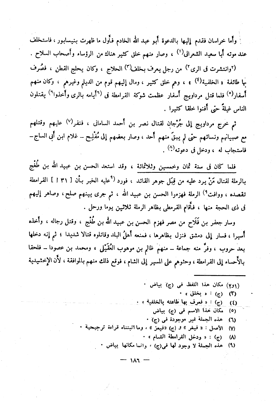 وانتشرت في الري من رجل يعرف بخلف الحلاج، وكان يحلج القطن، فصرف بها طائفة الخلفية، وهم خلق كثير، ومال إليهم قوم من الديلم وغيرهم، وكان منهم أسفار فلما قتل مرداويج أسفار عظمت شوكة القرامطة في أيامه بالري وأخذوا يقتلون الناس غيلةً حتى أفنوا خلقا كثيرا.