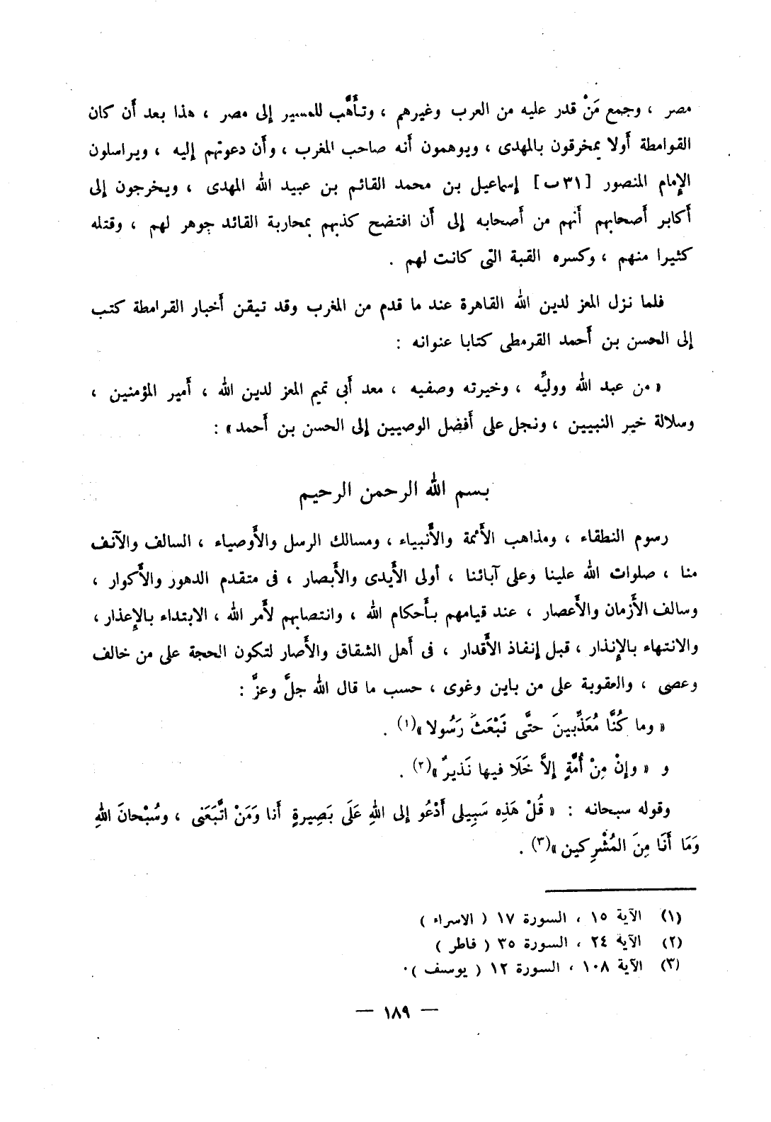 فلما نزل المعز لدين الله القاهرة عند ما قدم من المغرب وقد تيقن أخبار القرامطة كتب إلى الحسن بن أحمد القرمطي كتابا عنوانه: من عبد الله ووليه، وخيرته وصفيه، معد أبي تميم المعز لدين الله، أمير المؤمنين، وسلالة خيبر النبيين، ونجل على أفضل الوصيين إلى الحسن بن أحمد: بسم الله الرحمن الرحيم
