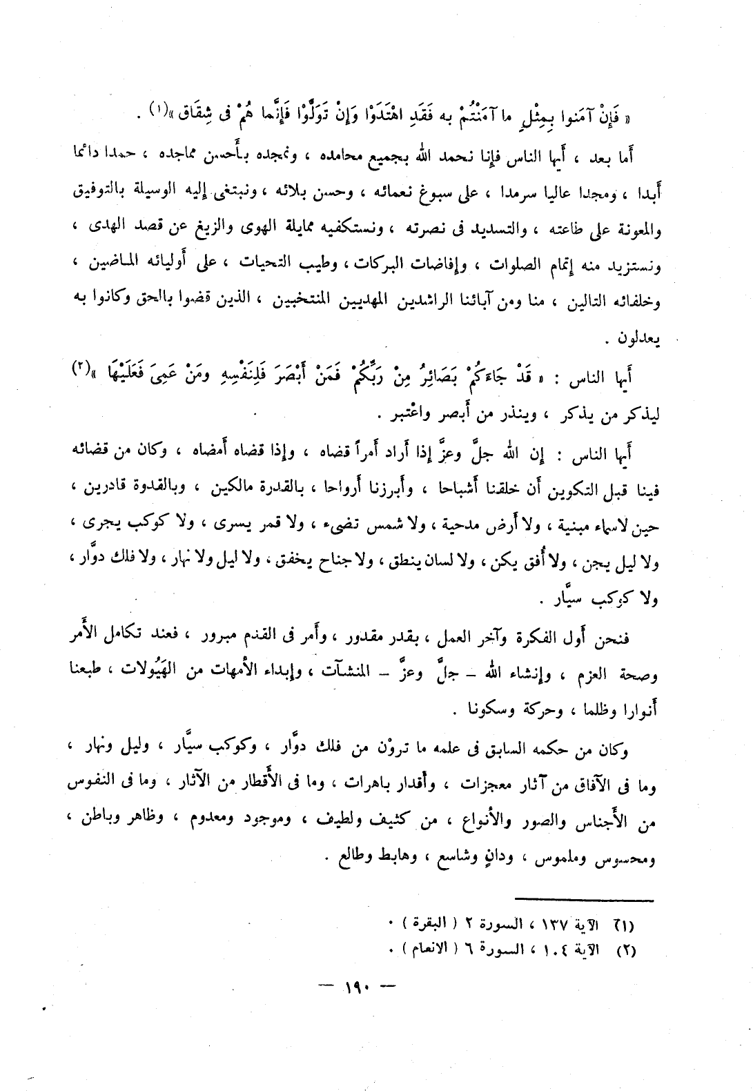 أما بعد، أيها الناس فإنا نحمد الله بجميع محامده، ونمجده بأحسن مماجده، حمداً دائماً أبداً، ومجداً عالياً سرمداً، على سبوغ نعمائه، وحسن بلائه، ونبتغي إليه الوسيلة بالتوفيق والمعونة على طاعته، والتسديد في نصرته، ونستكفيه ممايلة الهوى والزيغ عن قصد الهدى، ونستزيد منه إتمام الصلوات، وإفاضات البركات، وطيب التحيات، على أوليائه الماضين، وخلفائه التالين، منا ومن آبائنا الراشدين المهديين المنتخبين، الذين قضوا بالحق وكانوا به يعدلون.