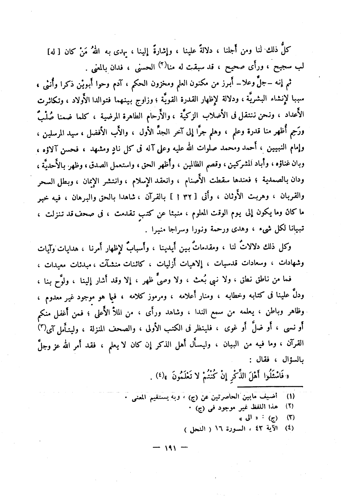فما من ناطق نطق، ولا نبي بعث، ولا وصي ظهر، إلا وقد أشار إلينا، ولوح بنا، ودل علينا في كتابه وخطابه، ومنار أعلامه، ومرموز كلامه، فيما هو موجود غير معدوم، وظاهر وباطن، يعمله من سمع الندا، وشاهد ورأى، من الملأ الأعلى؛ فمن أغفل منكم أو نسى، أو ضل أو غوى، فلينظر في الكتب الأولى، والصحف المنزلة، وليتأمل آي القرآن، وما فيه من البيان، وليسأل أهل الذكر إن كان لا يعلم، فقد أمر الله عز وجل بالسؤال، فقال: " فَاسْئَلُوا أَهْلَ الذِّكْرِ إِنْ كُنْتُمْ لا تَعْلَمُونَ ".