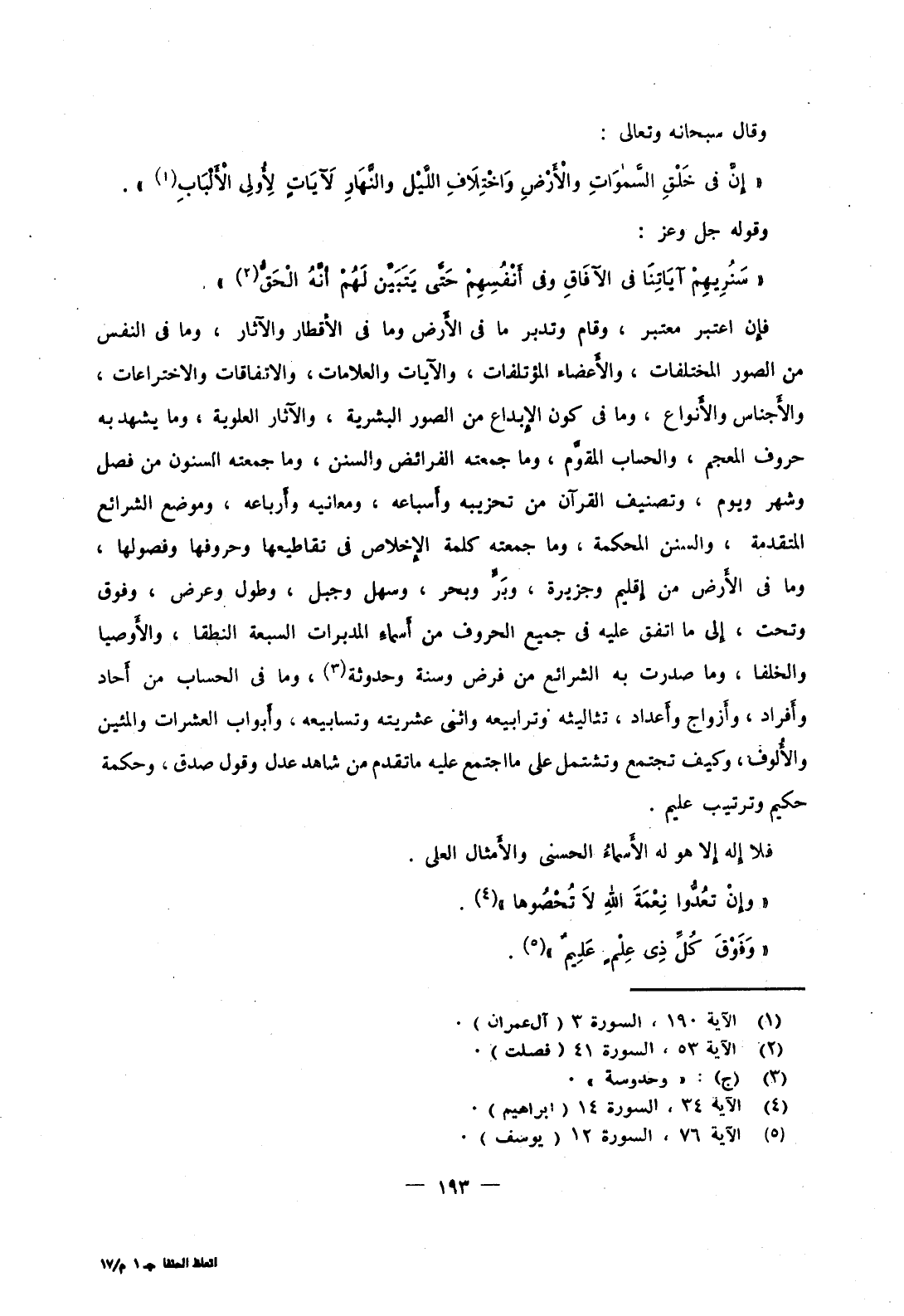 فإن اعتبر معتبر، وقام وتدبر ما في الأرض وما في الأقطار والآثار، وما في النفس من الصور المختلفات، والأعضاء المؤتلفات، والآيات والعلامات، والاتفاقات والاختراعات، والأجناس والأنواع، وما في كون الإبداع من الصور البشرية، والآثار العلوية، وما يشهد به حروف المعجم، والحساب المقوم، وما جمعته الفرائض والسنن، وما جمعته السنون من فصل وشهر ويوم، وتصنيف القرآن من تحزيبه وأسباعه، ومعانيه وأرباعه، وموضع الشرائع المتقدمة، والسنن المحكمة، وما جمعته كلمة الإخلاص في تقاطيعها وحروفها وفصولها، وما في الأرض من إقليم وجزيرة، وبر وبحر، وسهل وجبل، وطول وعرض، وفوق وتحت، إلى ما اتفق عليه في جميع الحروف من أسماء المدبرات السبعة النطقا، والأوصيا والخلفا، وما صدرت به الشرائع من فرض وسنة وحدوثة، وما في الحساب من أحاد وأفراد، وأزواج وأعداد، تثاليثه وترابيعه واثنى عشريته وتسابيعه، وأبواب العشرات والمئين والألوف، وكيف تجتمع وتشتمل على ما اجتمع عليه ما تقدم من شاهد عدل وقول صدق، وحكمة حكيم وترتيب عليم.