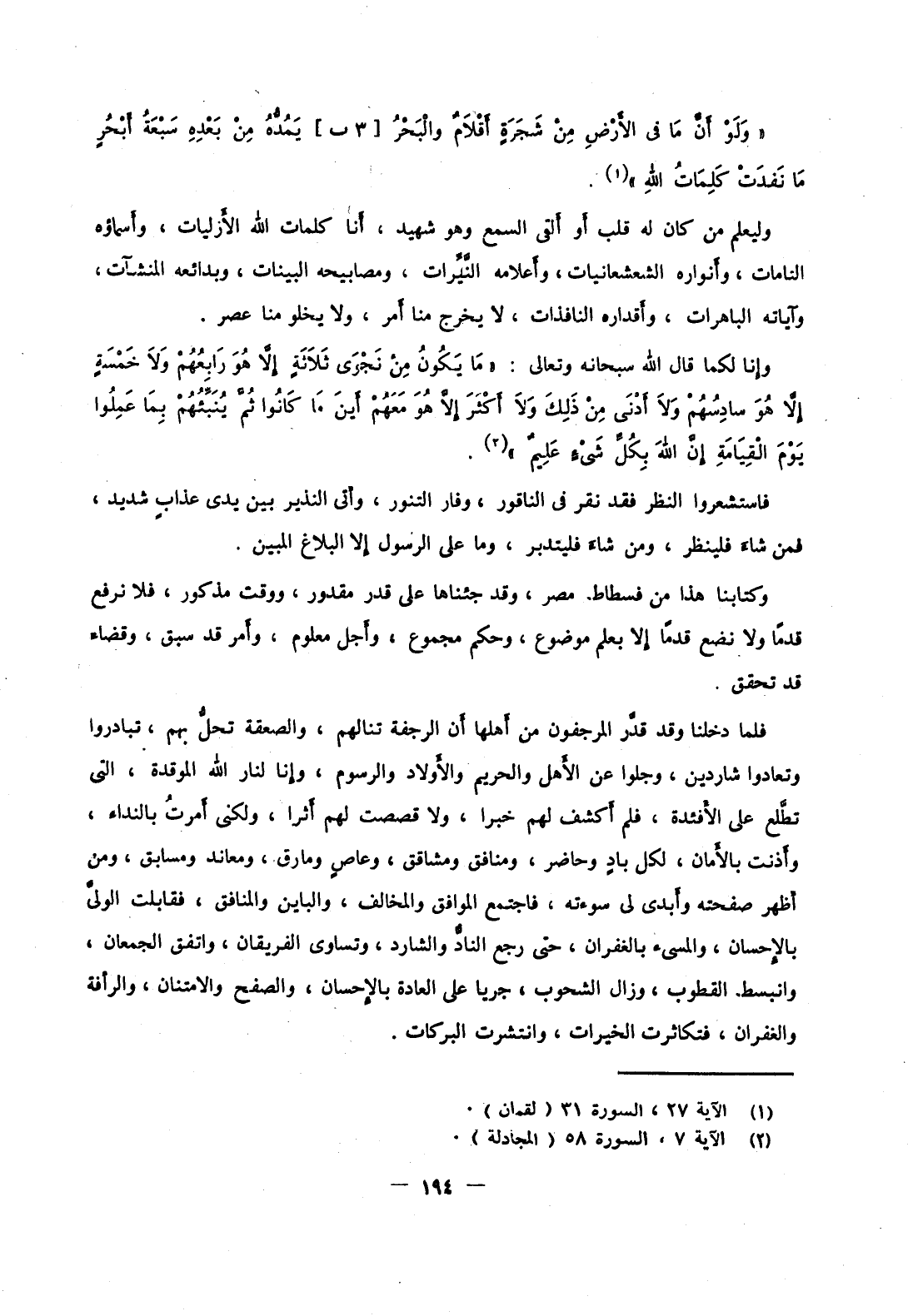 وَلَوْ أَنَّ مَا في الأَرْضِ مِنْ شَجَرَةٍ أَقْلاَمٌ والْبَحْرُ يَمُدُّهُ مِنْ بَعْدِهِ سَبْعَةُ أَبْحُرٍ مَا نَفدَتْ كَلِمَاتُ اللهِ ".