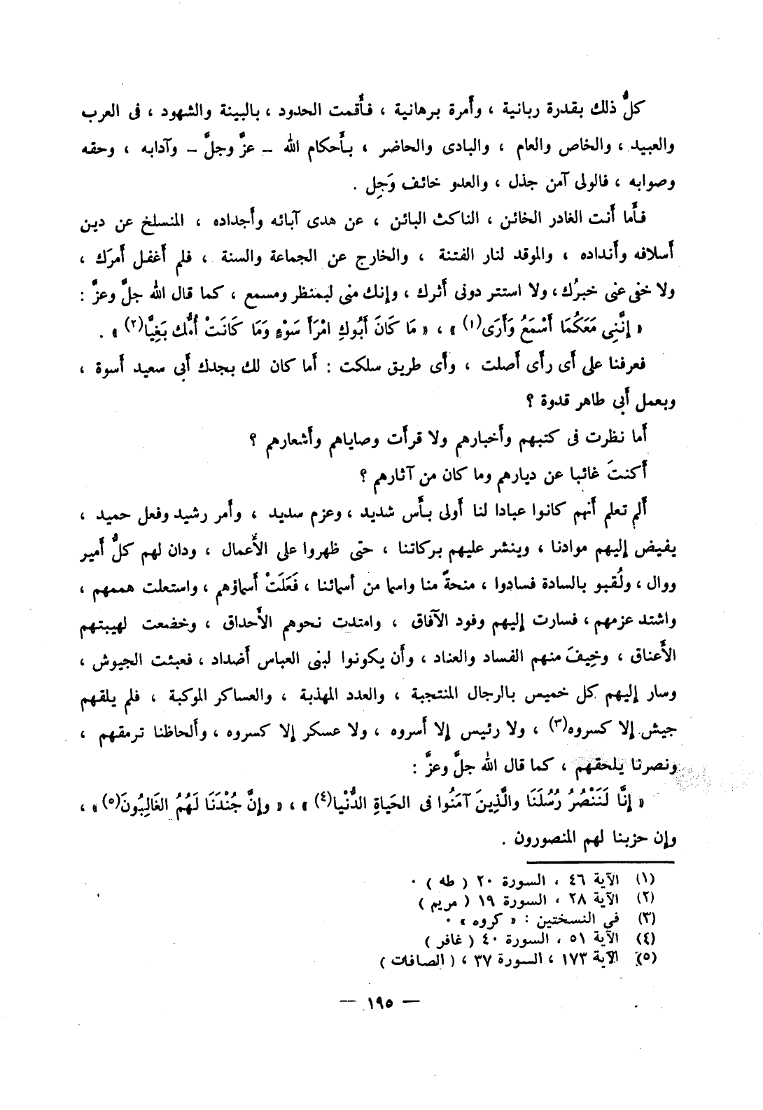 فعرفنا على أي رأي أصلت، وأي طريق سلكت: أما كان لك بجدك أبي سعيد أسوة، وبعمل أبي طاهر قدوة؟ أما نظرت في كتبهم وأخبارهم ولا قرأت وصاياهم وأشارهم؟ أكنت غائبا عن ديارهم وما كان من آثارهم؟ ألم تعلم أنهم كانوا عبادا لنا أولى بأس شديد، وعزم سديد، وأمر رشيد وفعل حميد، يفيض إليهم موادنا، وينشر عليهم بركاتنا، حتى ظهروا على الأعمال، ودان لهم كل أمير ووال، ولقبوا بالسادة فسادوا، منحةً منا واسما من أسمائنا، فعلت أسماؤهم، واستعلت هممهم، واشتد عزمهم، فسارت إليهم وفود الآفاق، وامتدت نحوهم الأحداق، وخضعت لهيبتهم الأعناق، وخيف منهم الفساد والعناد، وأن يكونوا لبني العباس أضداد، فعبئت الديوش، وسار إليهم كل خميس بالرجال المنتجبة، والعدد المهذبة، والعساكر الموكبة، فلم يلقهم جيش إلا كسروه، ولا رئيس إلا أسروه، ولا عسكر إلا كسروه، وألحاظنا ترمقهم، ونصرنا يلحقهم، كما قال الله جل وعز: " إِنَّا لَنَنْصُرُ رُسُلَنَا والَّذِينَ آمَنُوا في الحَياةِ الدُّنْيا "، " وإِنَّ جُنْدَنَا لَهُمُ الغَالِبُونَ "، وإن حزبنا لهم المنصورون.