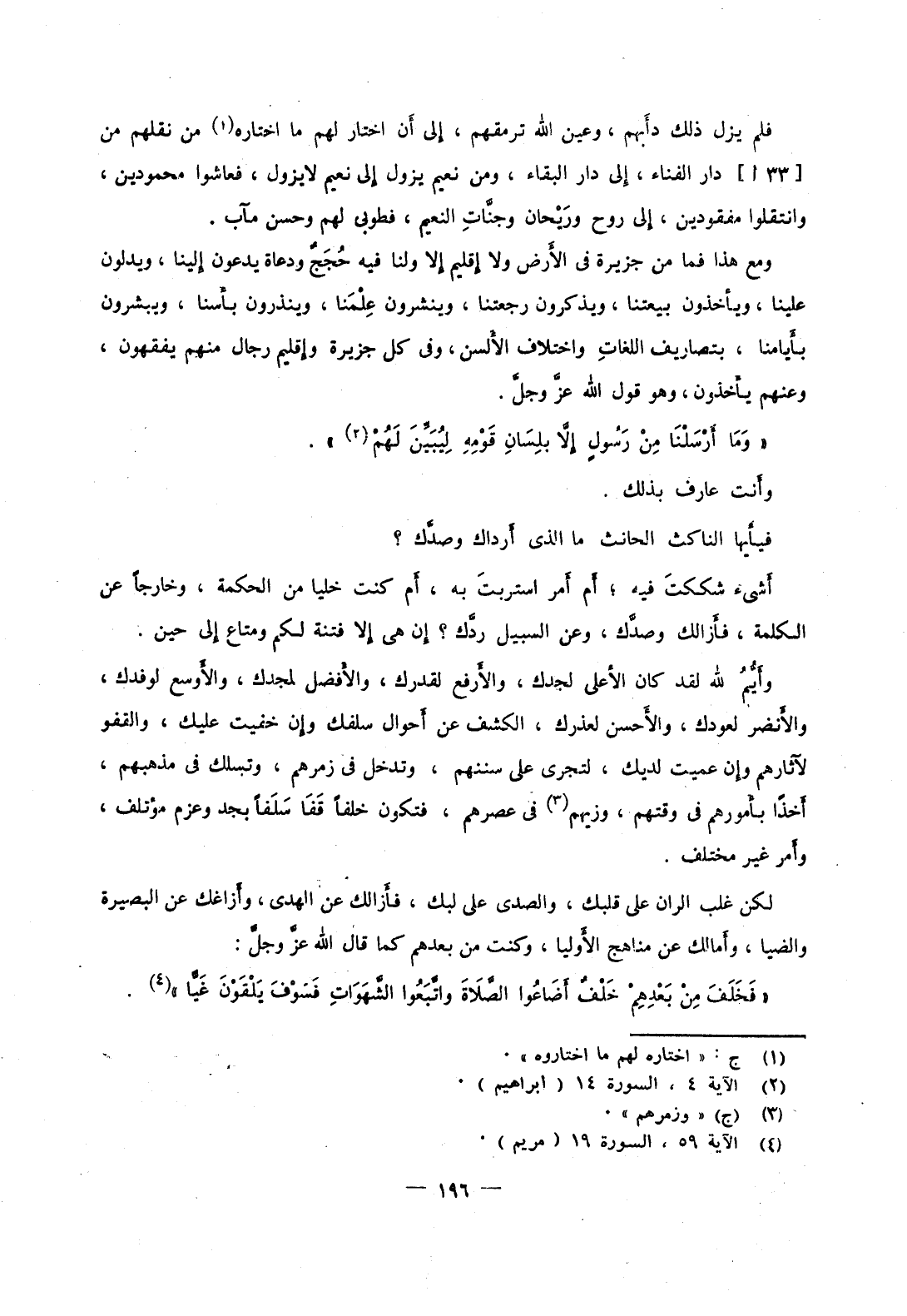 لكن غلب الران على قلبك، والصدى على لبك، فأزالك عن الهدى وأزاغك عن البصيرة والضيا، وأمالك عن مناهج الأوليا، وكنت من بعدهم كما قال الله عز وجل: " فَخَلَفَ مِنْ بَعْدِهِمْ خَلْفٌ أَضَاعُوا الصَّلاَةَ واتَّبَعُوا الشَّهَوَاتِ فَسَوْفَ يَلْقَوَنَ غَيَّا ".