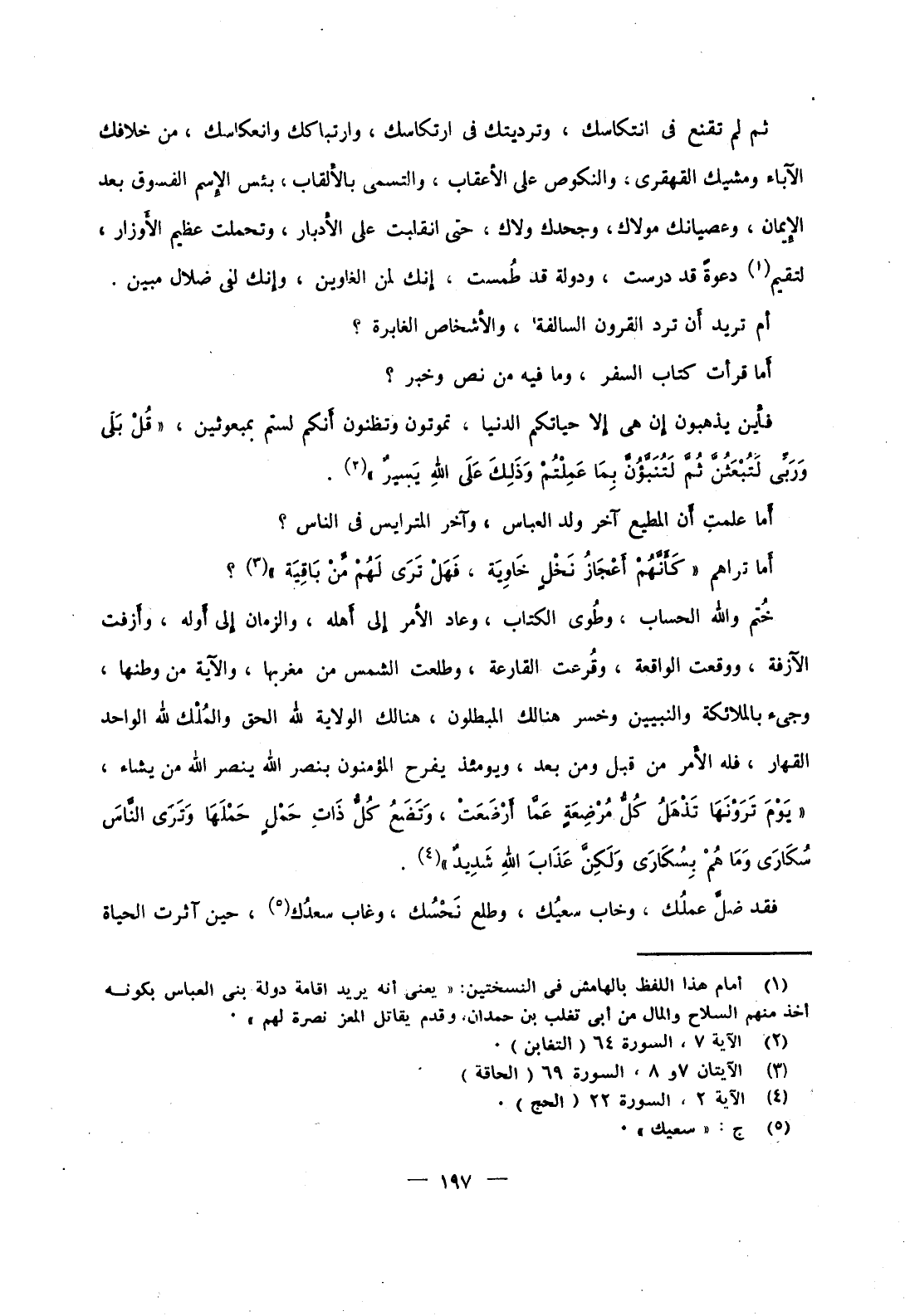 أما علمت أن المطيع آخر ولد العباس، وآخر المترايس في الناس؟ أما تراهم " كَأَنَّهُمْ أَعْجَازُ نَخْلٍ خَاوِيَة، فَهَلْ تَرَى لَهُمْ مِّنْ بَاقِيَة "؟ ختم والله الحساب، وطوى الكتاب، وعاد الأمر إلى أهله، والزمان إلى أوله، وأزفت الآزفة، ووقعت الواقعة، وقرعت القارعة، وطلعت الشمس من مغربها، والآية من وطنها، وجيء بالملائكة والنبيين وخسر هنالك المبطلون، هنالك الولاية لله الحق ينصر الله من يشاء، " يَوْمَ تَرَوْنَهَا تَذْهَلُ كُلُّ مُرْضِعَةٍ عَمَّا أَرْضَعَتْ، وَتَضَعُ كُلُّ ذَاتِ حَمْلٍ حَمْلَهَا وَتَرَى النَّاسَ سُكَارَى وَمَا هُمْ بِسُكَارَى وَلَكِنَّ عَذَابَ اللهِ شَدِيدٌ ".