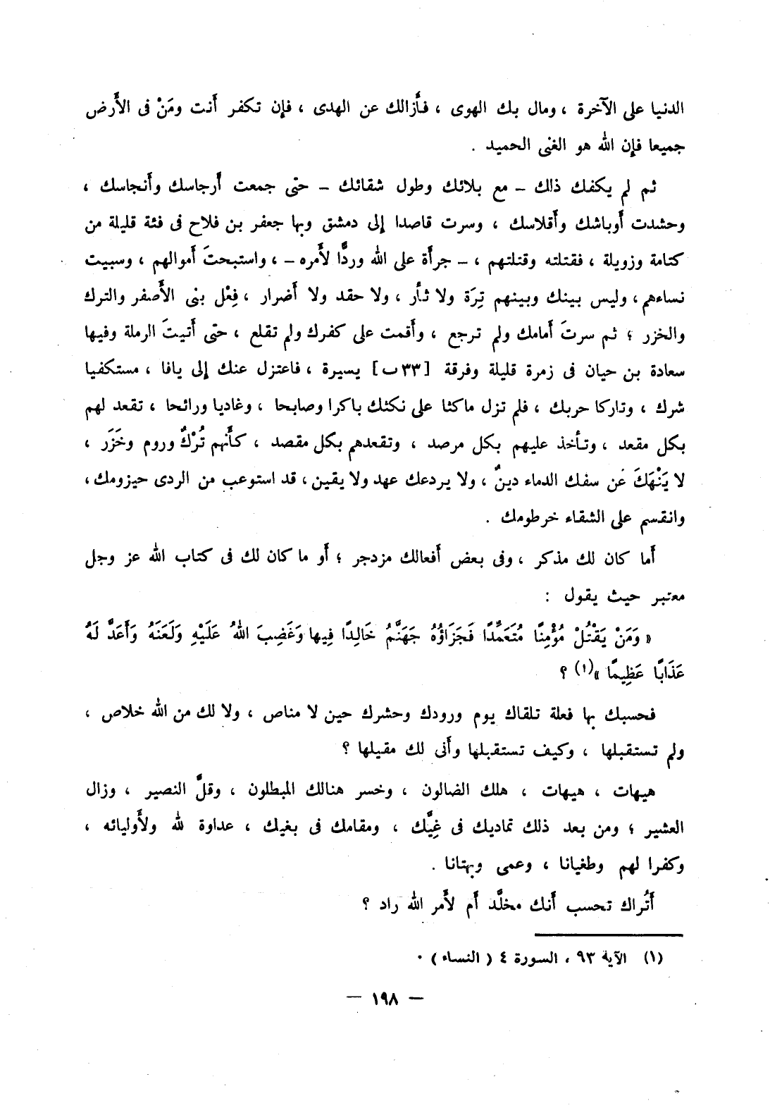 أما كان لك مذكر، وفي بعض أفعالك مزدجر؛ أو ما كان لك في كتاب الله عز وجل معتبر حيث يقول: " وَمَنْ يَقْتُلْ مُؤْمِناً مُتَعَمِّداُ فَجَزَاؤُهُ جَهَنَّمُ خَالِداً فِيها وَغَضِبَ اللهُ عَلَيْهِ وَلَعَنَهُ وَأَعَدَّ لَهُ عَذَاباً عَظِيماً "؟ فحسبك بها فعلة تلقاك يوم ورودك وحشرك حين لا مناص، ولا لك من الله خلاص، ولم تستقبلها، وكيف تستقبلها وأنى لك مقيلها؟ هيهات، هيهات، هلك الضالون، وخسر هنالك المبطلون، وقل النصير، وزال العشير؛ ومن بعد ذلك تماديك في غيك، ومقامك في بغيك، عداوة الله ولأوليائه، وكفرا لهم وطغيانا، وعمى وبهتانا.