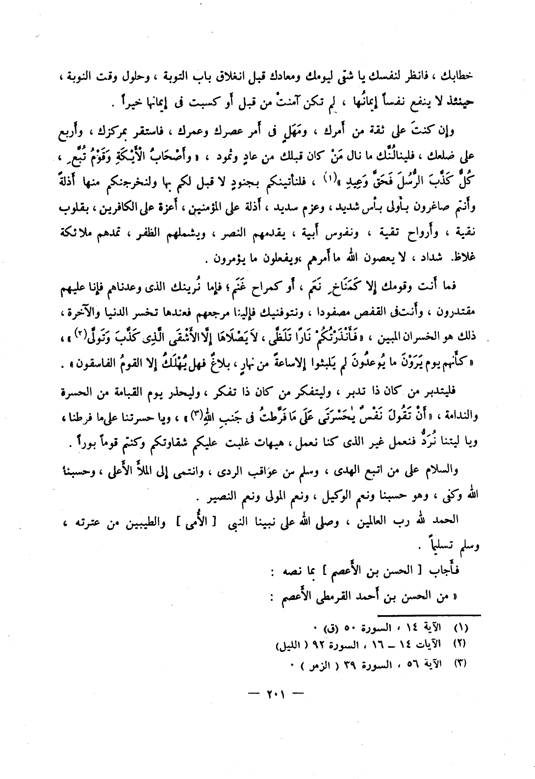 فأجاب الحسن بن الأعصم بما نصه: من الحسن بن أحمد القرمطي الأعصم: