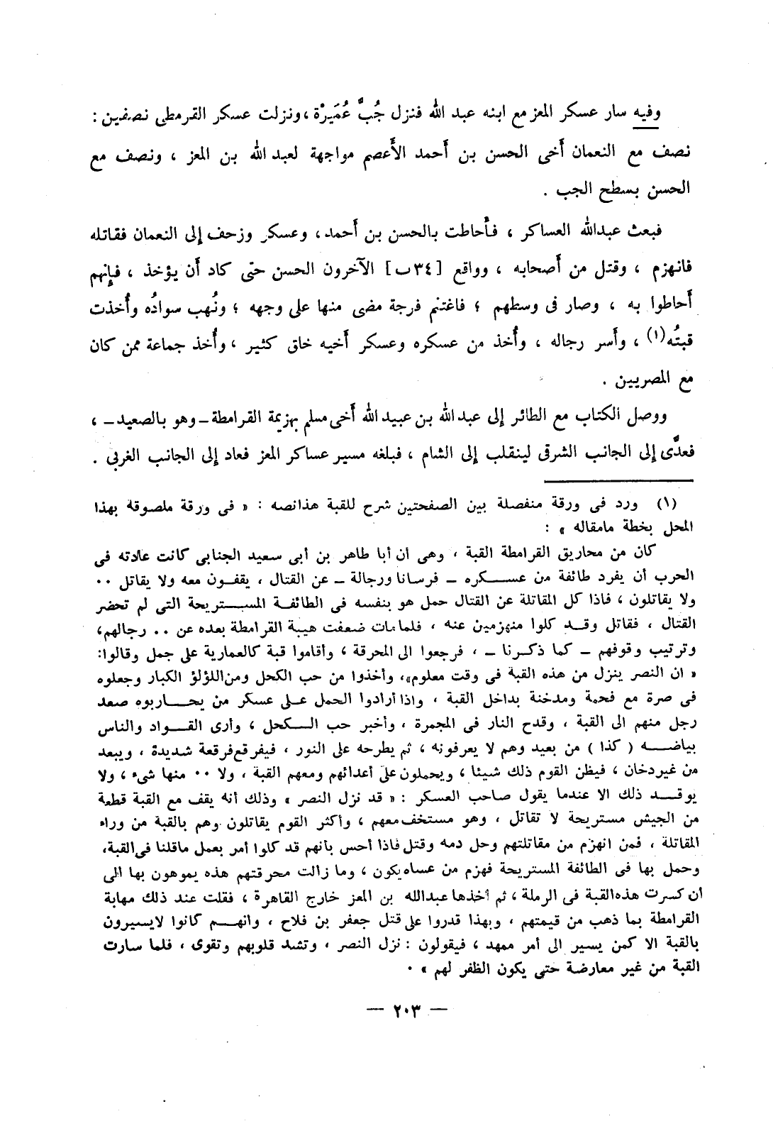 وفيه سار عسكر المعز مع ابنه عبد الله فنزل جب عميرة، ونزلت عسكر القرمطي نصفين: نصف مع النعمان أخي الحسن بن أحمد الأعصم مواجهة لعبد الله بن المعز، ونصف مع الحسن بسطح الجب.