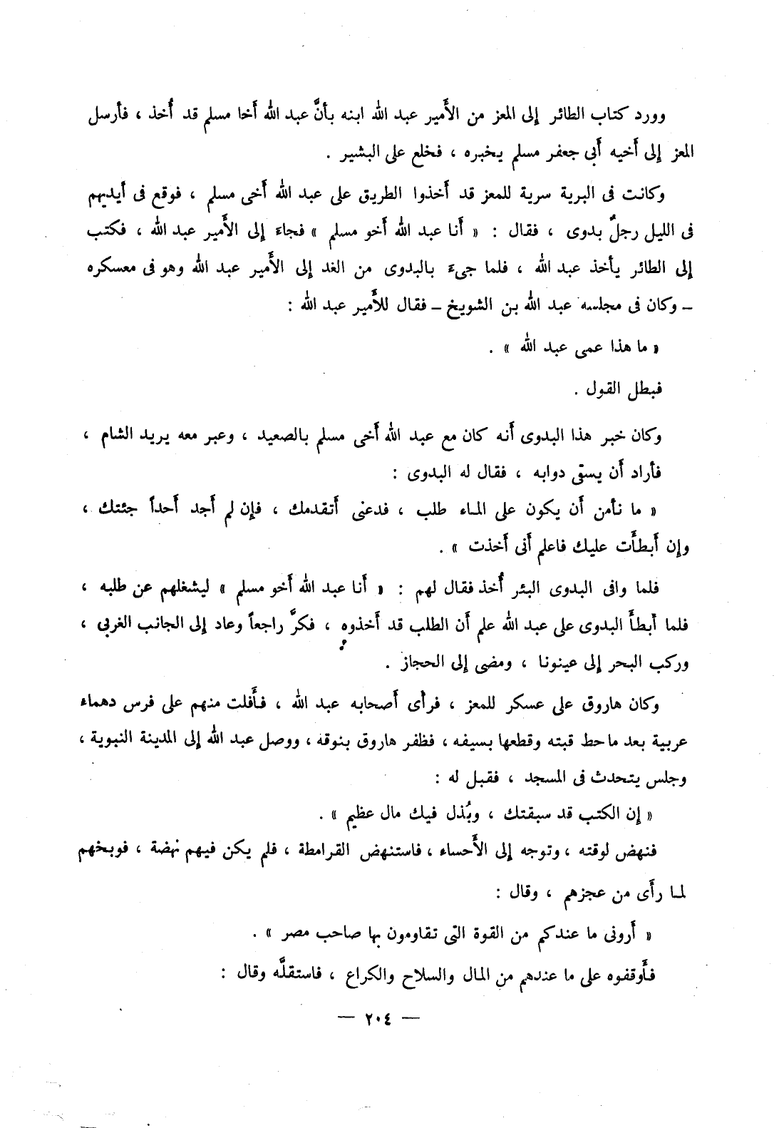وكانت في البرية سرية للمعز قد أخذوا الطريق على عبد الله أخي مسلم، فوقع في أيديهم في الليل رجل بدوي، فقال: أنا عبد الله أخو مسلم فجاء إلى الأمير عبد الله، فكتب إلى الطائر يأخذ عبد الله، فلما جيء بالبدوي من الغد إلى الأمير عبد الله وهو في معسكره وكان في مجلسه عبد الله بن الشويخ فقال للأمير عبد الله: ما هذا عمي عبد الله.