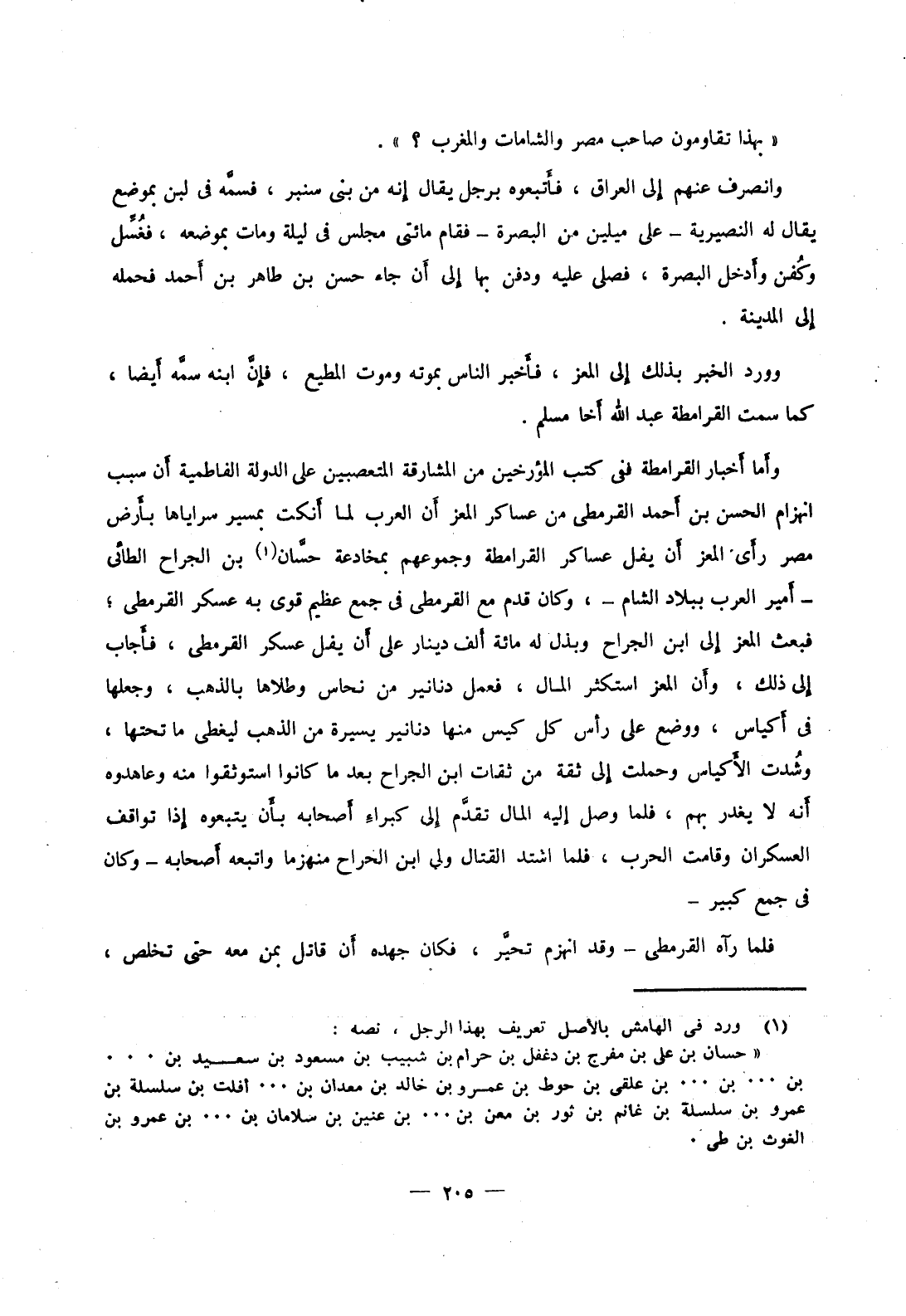 وأما أخبار القرامطة ففي كتب المؤرخين من المشارقة المتعصبين على الدولة الفاطمية أن سبب انهزام الحسن بن أحمد القرمطي من عساكر المعز أن العرب لما أنكت بمسير سراياها أرض مصر رأى المعز أن يفل عساكر القرامطة وجموعهم بمخادعة حسان بن الجارح الطائي أمير العرب ببلاد الشام، وكان قدم مع القرمطي في جمع عظيم قوى به عسكر القرمطي؛ فبعث المعز إلى ابن الجارح وبذل له مائة ألف دينا على أن يفل عسكر القرمطي، فأجاب إلى ذلك، وأن المعز استكثر المال، فعمل دنانير من نحاس وطلاها بالذهب، وجعلها في أكياس، ووضع على رأس كل كيس منها دنانير يسيرة من الذهب ليغطي ما تحتها، وشدت الأكياس وحملت إلى ثقة من ثقات ابن الجراح بعد ما كانوا استوثقوا منه وعاهدوه أنه لا يغدر بهم، فلما وصل إليه المال تقدم إلى كبراء أصحابه بأن يتبعوه إذا تواقف العسكران وقامت الحرب، فلما اشتد القتال ولي ابن الجراح منهزما واتبعه أصحابه وكان في جمع كبير فلما رآه القرمطي وقد انهزم تحير، فكان جهده أن قاتل بمن معه حتى تخلص،