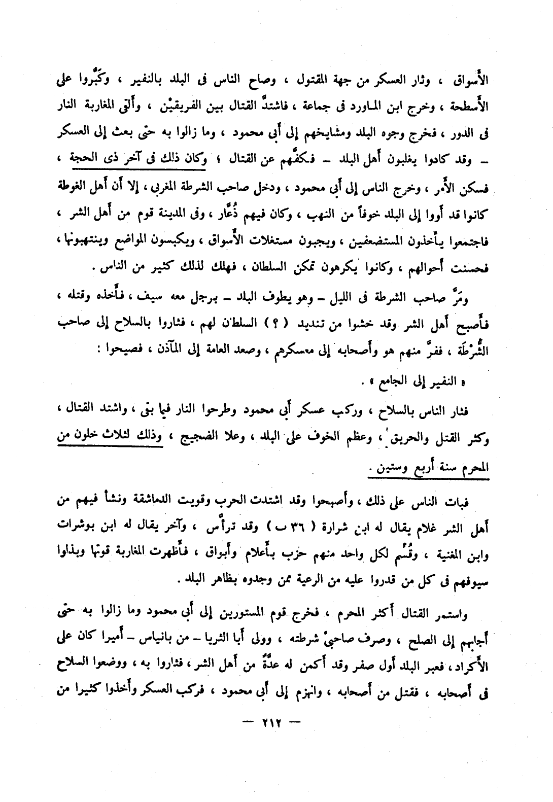 فثار الناس بالسلاح، وركب عسكر أبي محمود وطرحوا النار فيما بقى، واشتد القتال، وكثر القتل والحريق، وعظم الخوف على البلد، وعلا الضجيج، وذلك لثلاث خلون من المحرم سنة أربع وستين.