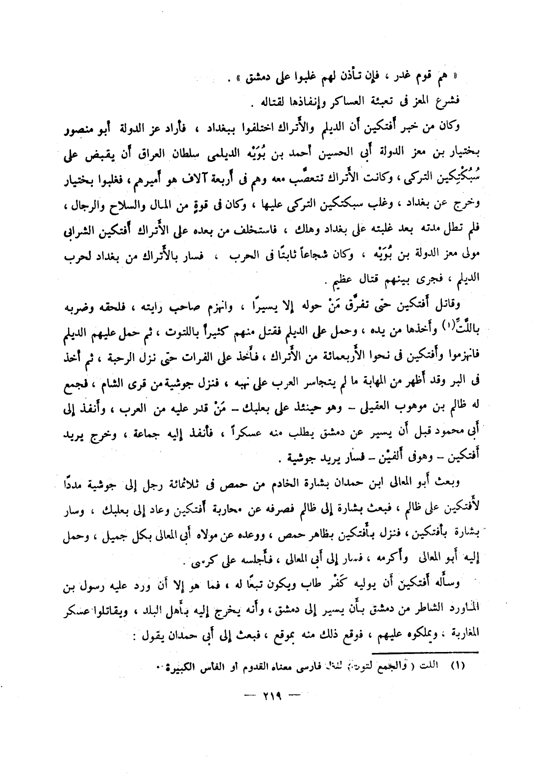 وقاتل أفتكين حتى تفرق من حوله إلا يسيراً، وانهزم صاحب رايته، فلحقه وضربه باللت وأخذها من يده، وحمل على الديلم فقتل منهم كثيراً باللتوت، ثم حمل عليهم الديلم فانهزموا وأفتكين في نحوا الأربعمائة من الأتراك، فأخذ على الفرات حتى نزل الرحبة، ثم أخذ في البر وقد أظهر من المهابة ما لم يتجاسر العرب على نهبه، فنزل جوشية من قرى الشام، فجمع له ظلم بن موهوب العقيلي وهو حينئذ على بعلبك من قدر عليه من العرب، وأنفذ إلى أبي محمود قبل أن يسير عن دمشق يطلب منه عسكراً، فأنفذ إليه جماعة، وخرج يريد أفتكين وهو في ألفين فسار يريد جوشية.