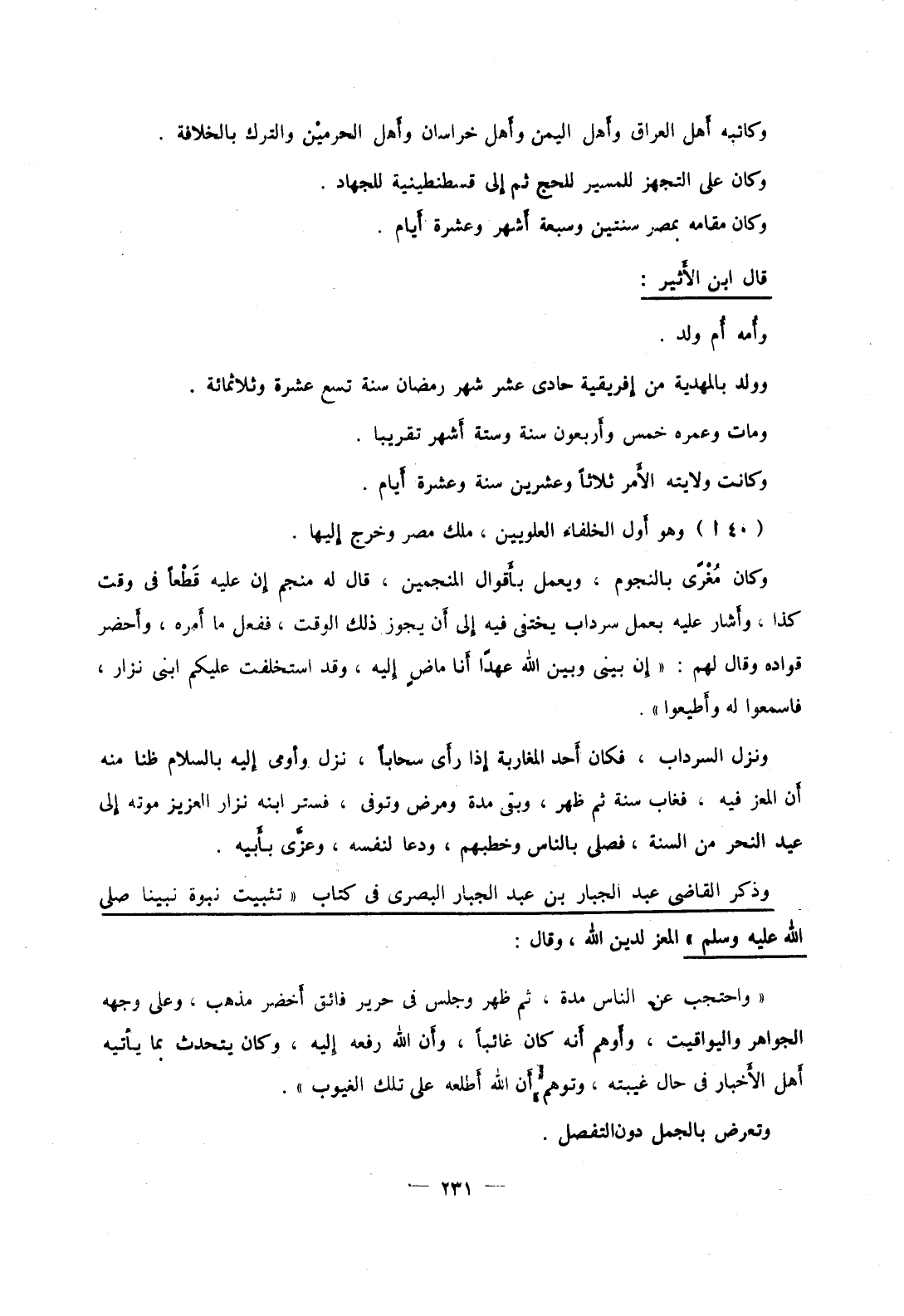 وذكر القاضي عبد الجبار بن عبد الجبار البصري في كتاب تثبيت نبوة نبينا صَلَّى اللهُ عَلَيْهِ وَسَلَّمَ المعز لدين الله، وقال: واحتجب عن الناس مدة، ثم ظهر وجلس في حرير فائق أخضر مذهب، وعلى وجهه الجواهر واليواقيت، وأوهم أنه كان غائباً، وأن الله رفعه إليه، وكان يتحدث بما يأتيه أهل الأخبار في حال غيبته، وتوهم أن الله أطلعه على تلك الغيوب.