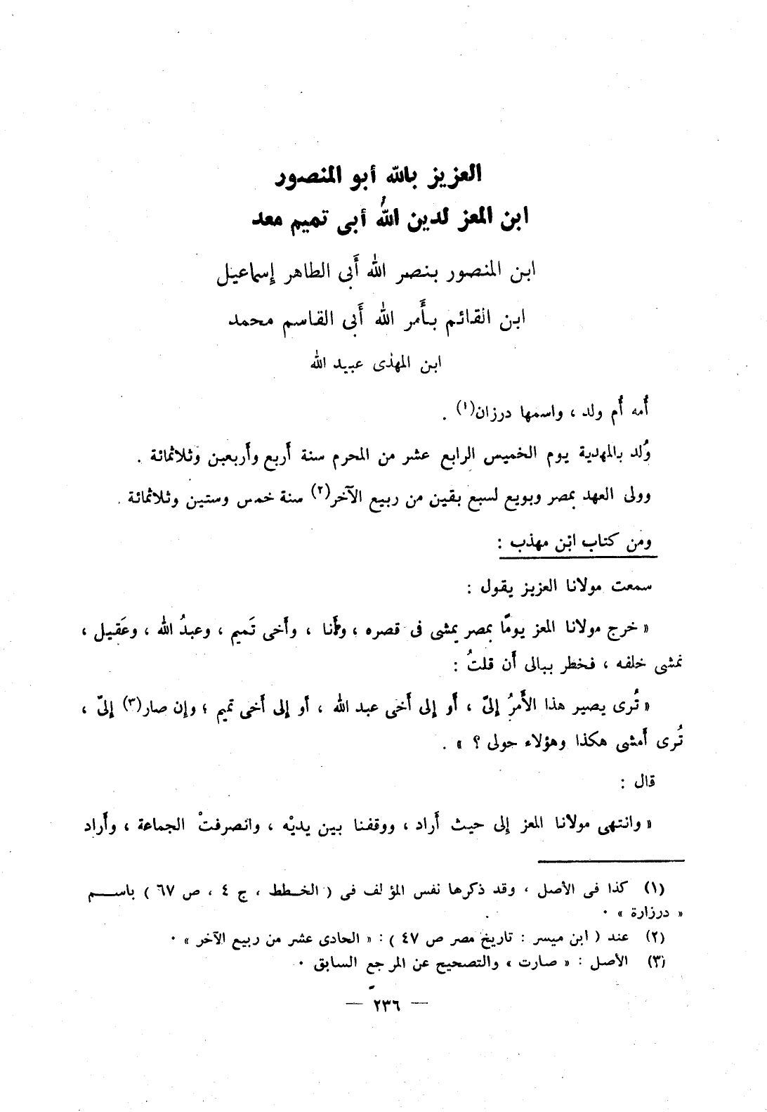 ومن كتاب ابن مهذب: سمعت مولانا العزيز يقول: خرج مولانا المعز يوماً بمصر يمشي في قصره، وأنا، وأخي تميم، وعبد الله، وعقيل، نمشي خلفه، فخطر ببالي أن قلت: ترى بصير هذا الأمر إلي، أو إلى أخي عبد الله، أو إلى أخي تميم؛ وإن صار إلي، ترى أمشي هكذا وهؤلاء حولي؟.