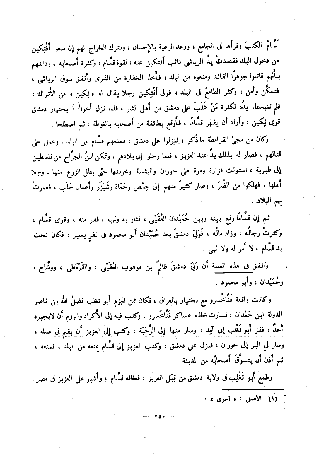 سام الكتب وقرأها في الجامع، ووعد الرعية بالإحسان، وبترك الخراج لهم إن منعوا أفتكين من دخول البلد فقصدت يد الرياشي نائب أفتكين عنه، لقوة قسام، وكثرة أصحابه، ودالتهم بأنهم قاتلوا جوهراً القائد ومنعوه من البلد، فأخذ الخفارة من القرى وأنفق سوق الرياشي، فتمكن وأمن، وكثر الطامع في البلد، فولى أفتكين رجلا يقال له تكين من الأتراك، فلم تنبسط يده لكثرة من غلب على دمشق من أهل الشر، فلما نزل أخوا بختيار دمشق قوى تكين، وأراد أن يقهر قساماً، فأوقع بطائفة من أصحابه بالغوطة، ثم اصطلحا.