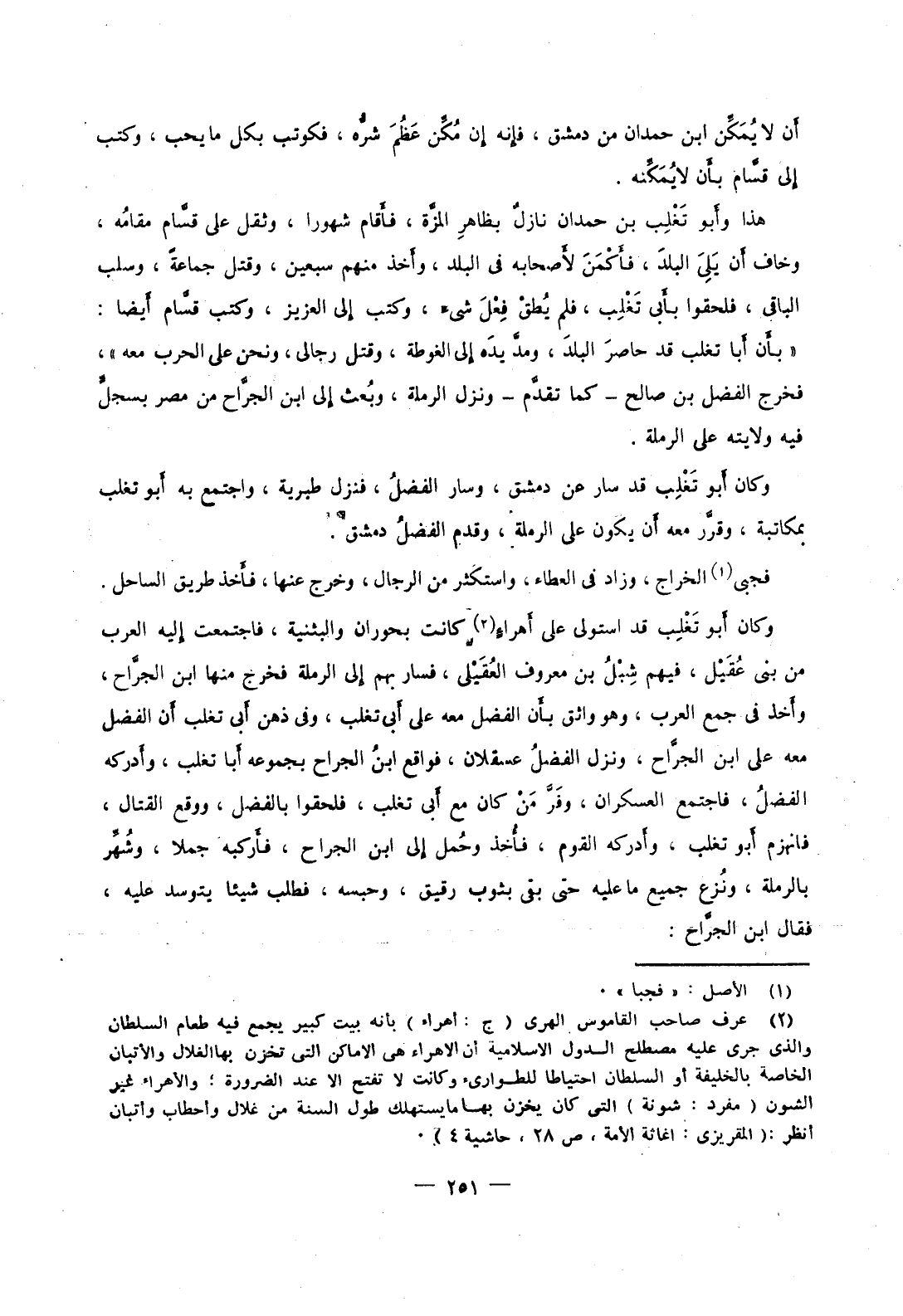 أن لا يمكن ابن حمدان من دمشق، فإنه إن مكن عظم شره، فكوتب بكل ما يحب، وكتب إلى قسام بأن لا يمكنه.