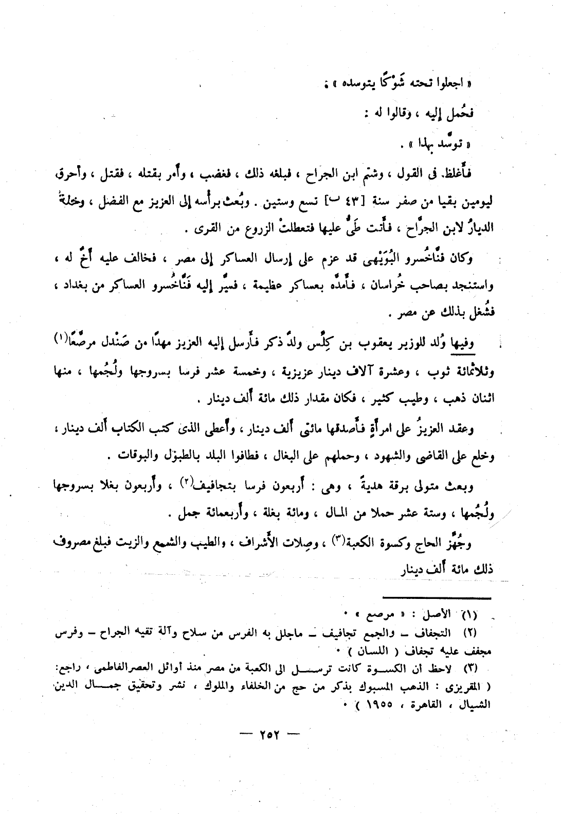 فأغلظ في القول، وشتم ابن الجراح، فبلغه ذلك، فغضب، وأمر بقتله، فقتل، وأحرق ليومين بقيا من صفر سنة تسع وستين، وبعث برأسه إلى العزيز مع الفضل، وخلة الديار لابن الجراح، فأتت طي عليها فتعطلت الزروع من القرى.