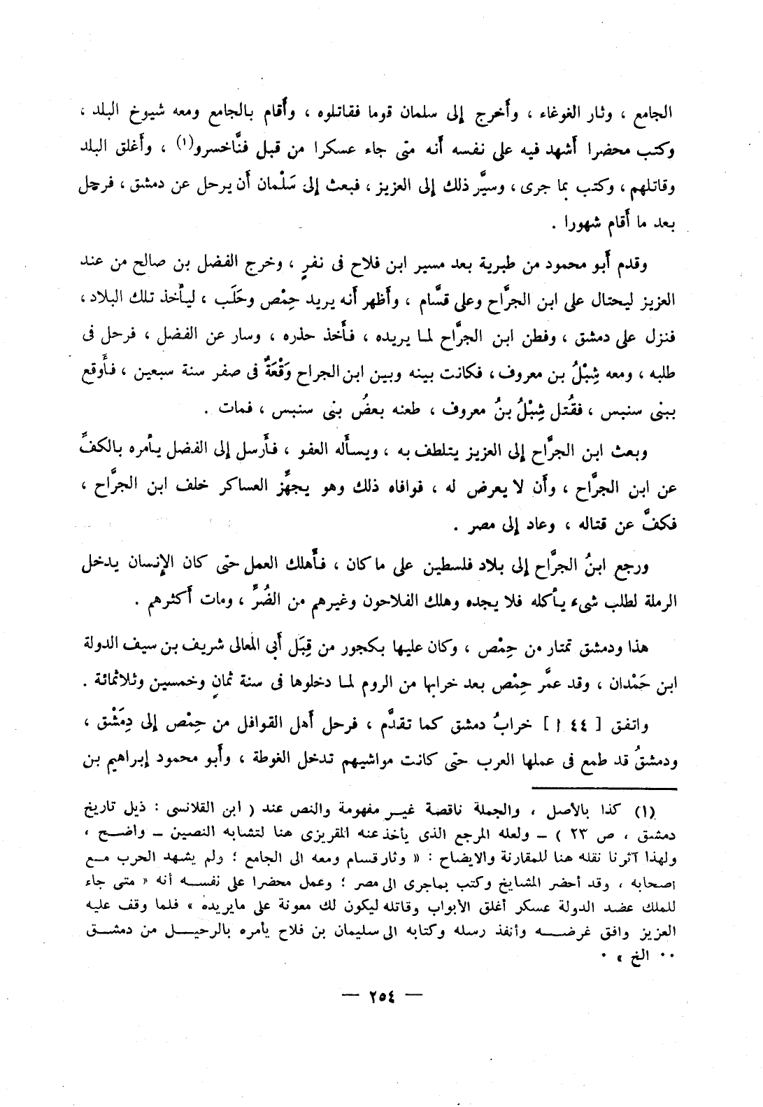الجامع، وثار الغوغاء، وأخرج إلى سلمان قوما فقاتلوه، وأقام بالجامع ومعه شيوخ البلد، وكتب محضرا أشهد فيه على نفسه أنه متى جاء عسكرا من قبل فناخسرو، وأغلق البلد وقاتلهم، وكتب بما جرى، وسير ذلك إلى العزيز، فبعث إلى سلمان أن يرحل عن دمشق، فرحل بعد ما أقام شهورا.