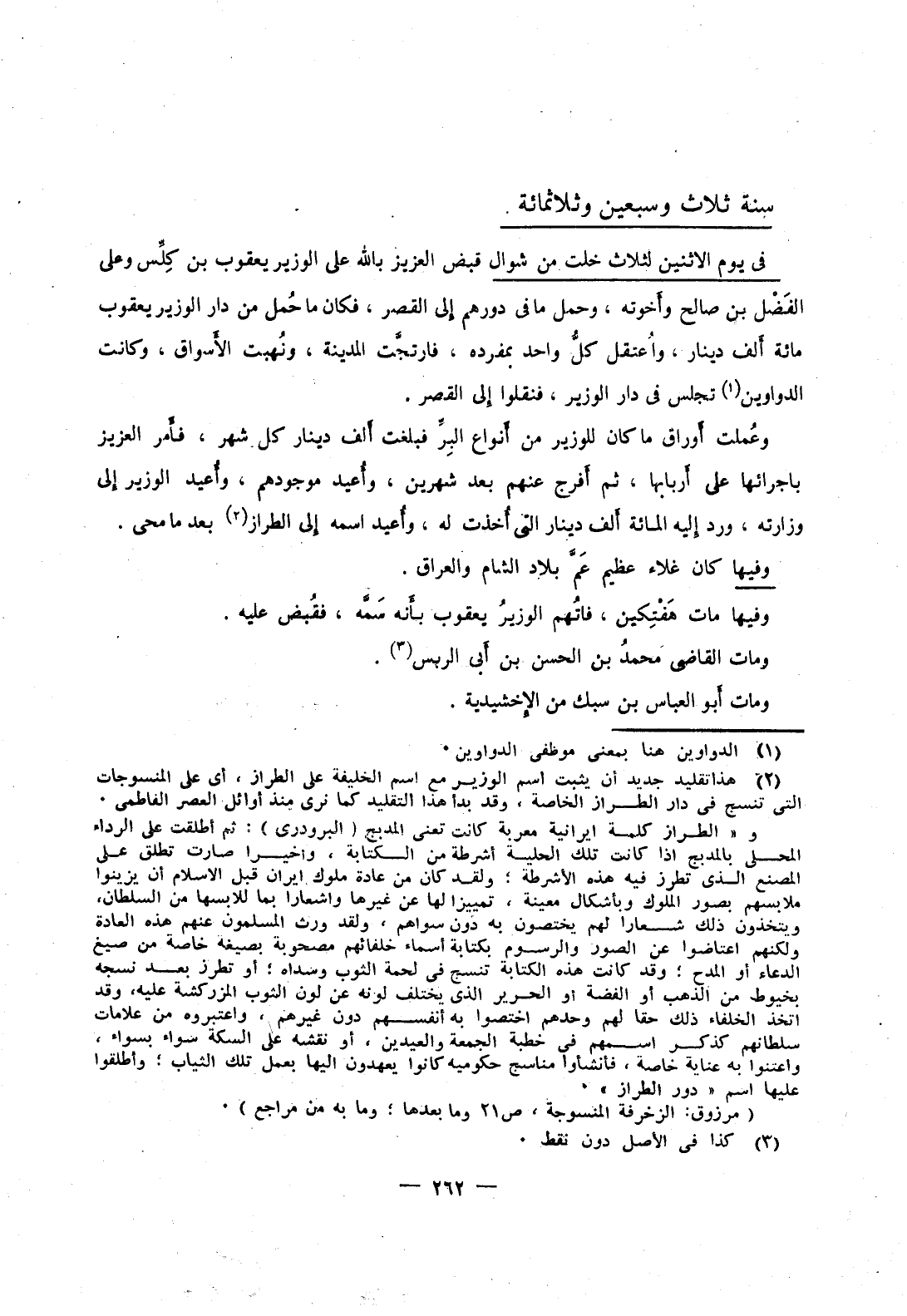 وعملت أوراق ما كان للوزير من أنواع البر فبلغت ألف دينار كل شهر، فأمر العزيز باجرائها على أربابها، ثم أفرج عنهم بعد شهرين، وأعيد موجودهم، وأعيد الوزير إلى وزارته، ورد إليه المائة ألف دينار التي أخذت له، وأعيد اسمه إلى الطراز بعد ما محى.