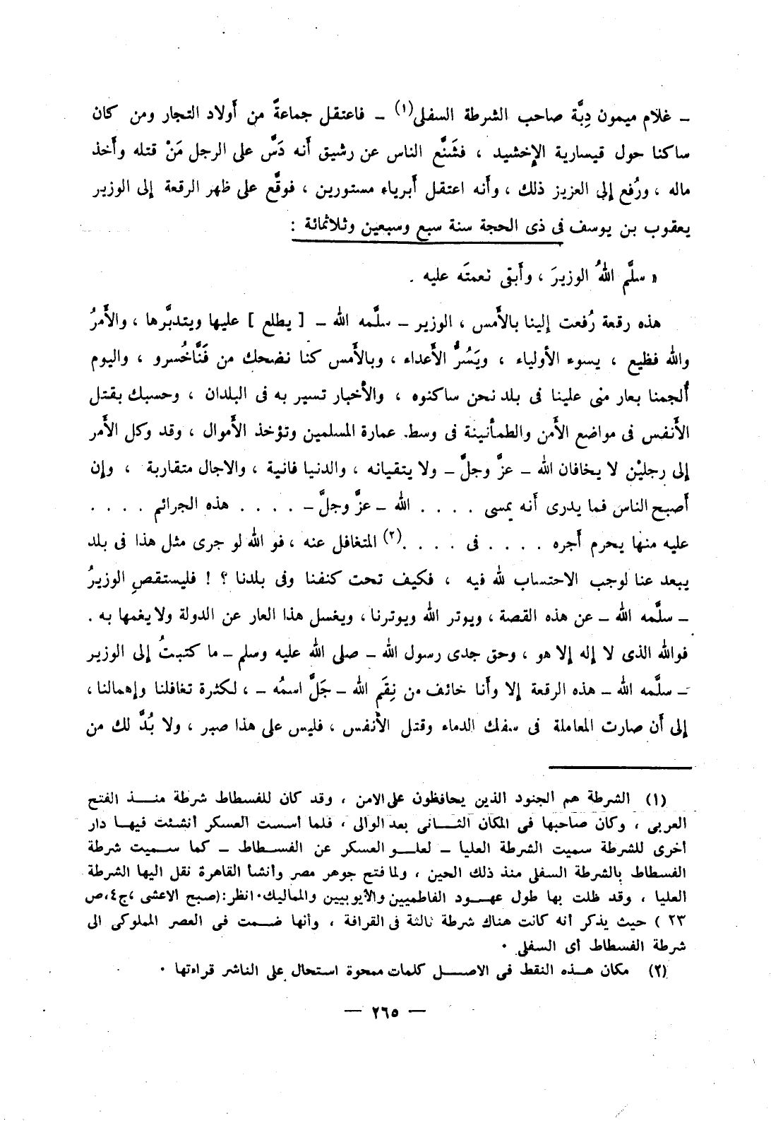هذه رقعة رفعت إلينا بالأمس، الوزير سلمه الله يطلع عليها ويتدبرها، والأمر والله فظيع، يسوء الأولياء، ويسر الأعداء، وبالأمس كنا نضحك من فناخسرو، واليوم ألجمنا بعار منى علينا في بلد نحن ساكنوه، والأخبار تسير به في البلدان، وحسبك بقتل الأنفس في مواضع الأمن والطمأنينة في وسط عمارة المسلمين وتؤخذ الأموال، وقد وكل الأمر إلى رجلين لا يخافان الله عز وجل ولا يتقيانه، والدنيا فانية، والاجال متقاربة، وإن أصبح الناس فما يدري أنه يمسي.... الله عز وجل.... هذه الجرائم.... عليه منها يحرم أجره.... في.... المتغافل عنه، فوالله لو جرى مثل هذا في بلد يبعد عنا لوجب الاحتساب لله فيه، فكيف تحت كنفنا وفي بلدنا؟! فليستقص الوزير سلمه الله عن هذه القصة، ويوتر الله ويوترنا، ويغسل هذا العار عن الدولة ولا يغمها به. فوالله الذي لا إله إلا هو، وحق جدي رسول الله صَلَّى اللهُ عَلَيْهِ وَسَلَّمَ ما كتبت إلى الوزير سلمه الله هذه الرقعة إلا وأنا خائف من نقم الله جل اسمه، لكثرة تغافلنا وإهمالنا، إلى أن صارت المعاملة في الدماء وقتل الأنفس، فليس على هذا صبر، ولا بد لك من
