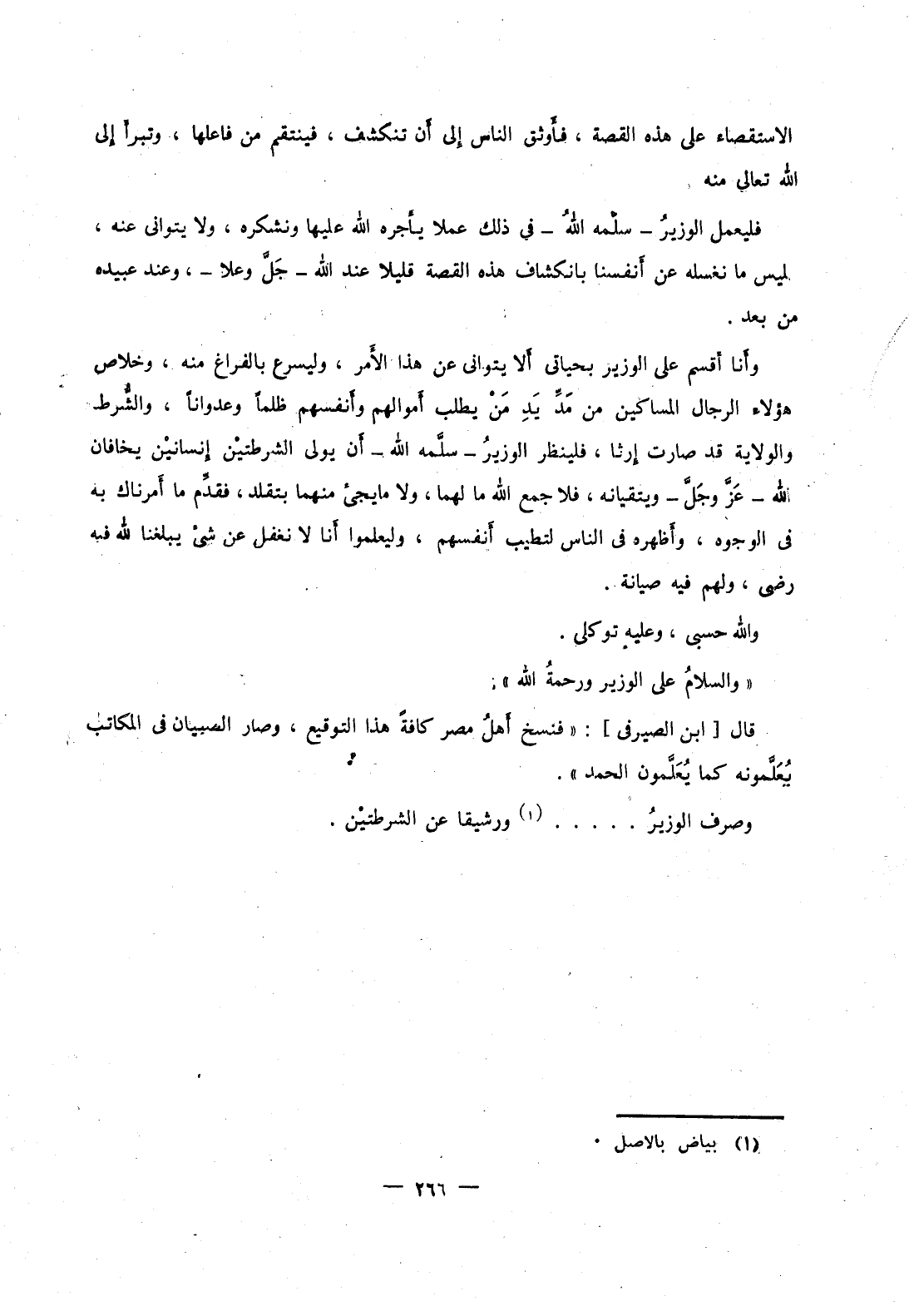 وأنا أقسم على الوزير بحياتي ألا يتوانى عن هذا الأمر، وليسرع بالفراغ منه، وخلاص هؤلاء الرجال المساكين من مد يد من يطلب أموالهم وأنفسهم ظلماً وعدواناً، والشرط والولاية قد صارت إرثا، فلينظر الوزير سلمه الله أن يولى الشرطتين إنسانين يخافان الله عز وجل ويتقيانه، فلا جمع الله ما لهما، ولا ما يجيء منهما بتقلد، فقدم ما أمرناك به في الوجوه، وأظهره في الناس لتطيب أنفسهم، وليعلموا أنا لا نغفل عن شيء يبلغنا الله فيه رضى، ولهم فيه صيانة.