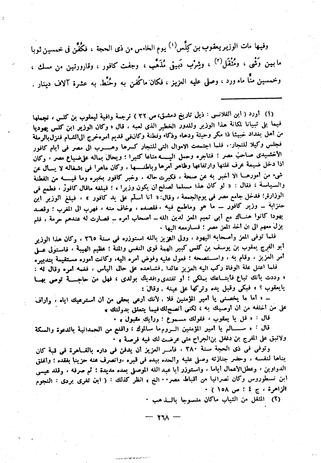 وفيها مات الوزير يعقوب بن كلس يوم الخامس من ذي الحجة، فكفن في خمسين ثوبا ما بين وشى، ومثقل، وشرب ديبقي مذهب، وجفت كافور، وقارورتين من مسك، وخمسين منا ماء ورد، وصلى عليه العزيز، فكان ما كفن به وحنط به عشرة آلاف دينار.
