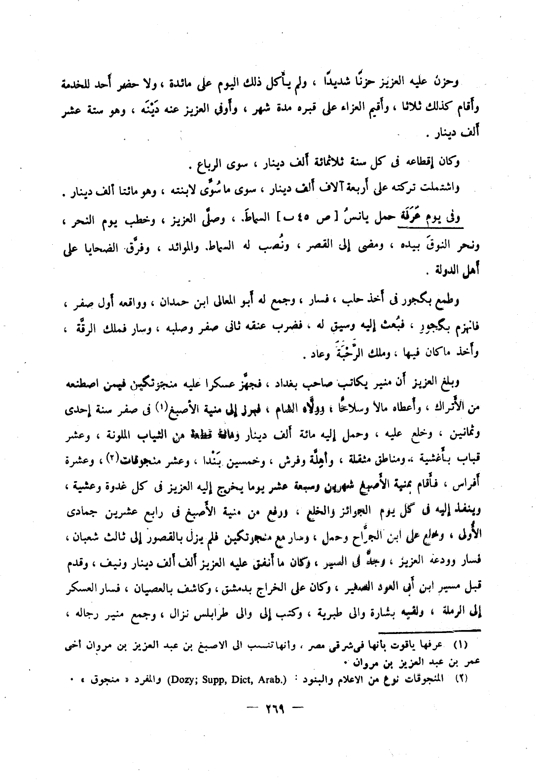 وبلغ العزيز أن منير يكاتب صاحب بغداد، فجهز عسكرا عليه منجوتكين فيمن اصطنعه من الأتراك، وأعطاه مالا وسلاحاً، وولاه الشام، فبرز إلى منية الأصبع في صفر سنة إحدى وثمانين، وخلع عليه، وحمل إليه مائة ألف دينار ومائة قطعة من الثياب الملونة، وعشر قباب بأغشية، ومناطق مثقلة، وأهلة وفرش، وخمسين بندا، وعشر منجوقات، وعشرة أفراس، فأقام بمنية الأصبغ شهرين وسبعة عشر يوما يخرج إليه العزيز في كل غدوة وعشية، وينفذ إليه في كل يوم الجوائز والخلع، ورفع من منية الأصبغ في رابع عشرين جمادى الأولى، وخلع على ابن الجراح وحمل، وسار مع منجوتكين فلم يزل بالقصور إلى ثالث شعبان، فسار وودعه العزيز، وجد في السير، وكان ما أنفق عليه العزيز ألف ألف دينار ونيف، وقدم قبل مسير ابن أبي العود الصغير، وكان على الخراج بدمشق، وكاشف بالعصيان، فسار العسكر إلى الرملة، ولقيه بشارة والي طبرية، وكتب إلى والي طرابلس نزال، وجمع منير رجاله،